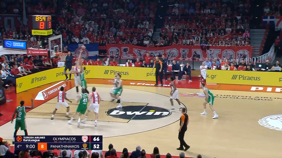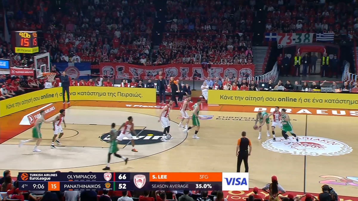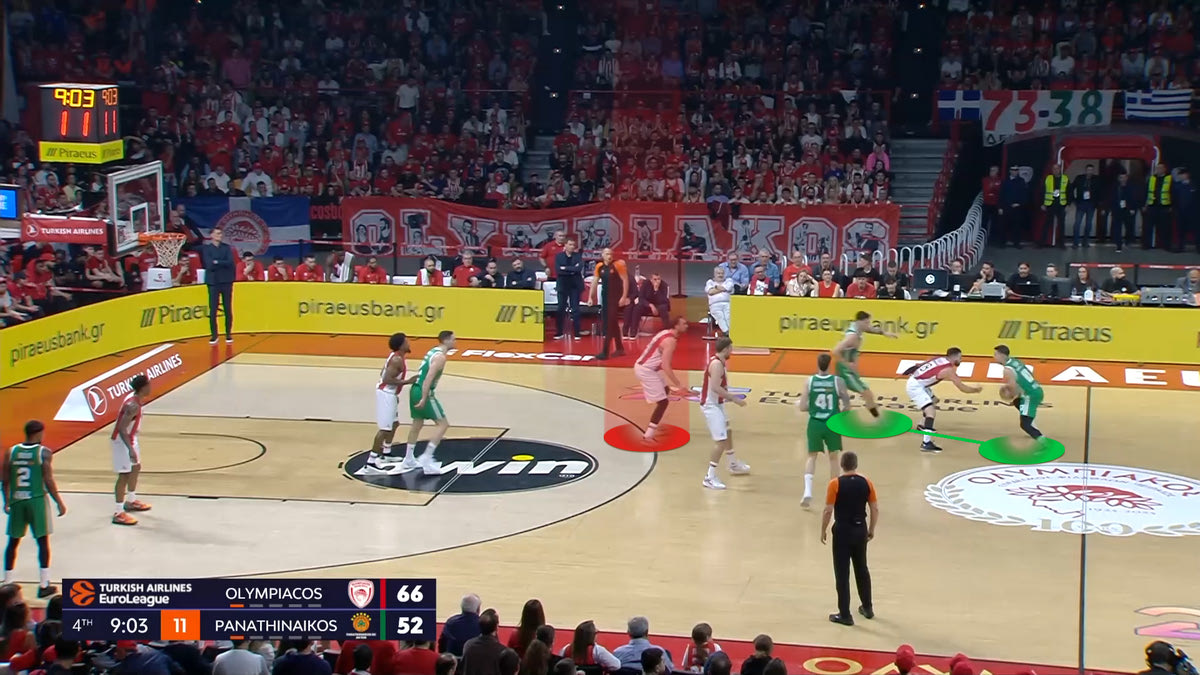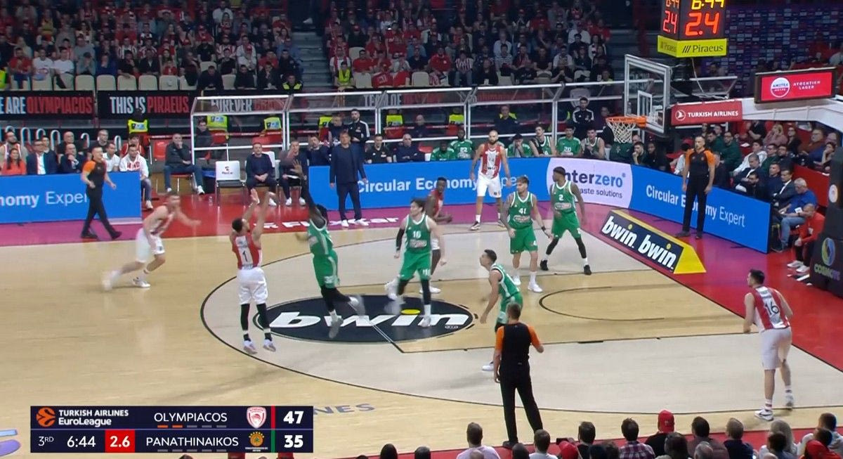 Ο Σλούκας βλέπει τον Μιλουτίνοβ να του παίρνει την επιλογή του σουτ και θέλει να πάει προς το καλάθι, με όλη την άμυνα του Ολυμπιακού να προσαρμόζεται πάνω του.