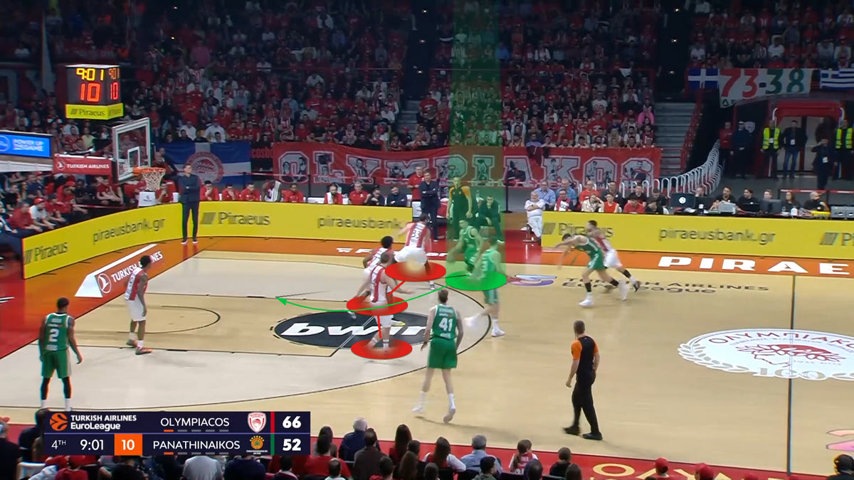 Ο Φαλ ποστάρει τον Χουάντσο, με τρεις παίκτες του Παναθηναϊκού AKTOR να είναι έτοιμοι να δώσουν βοήθεια, την οποία τελικά θα την δώσει ο Οσμάν, που βρίσκεται κάτω από το καλάθι.