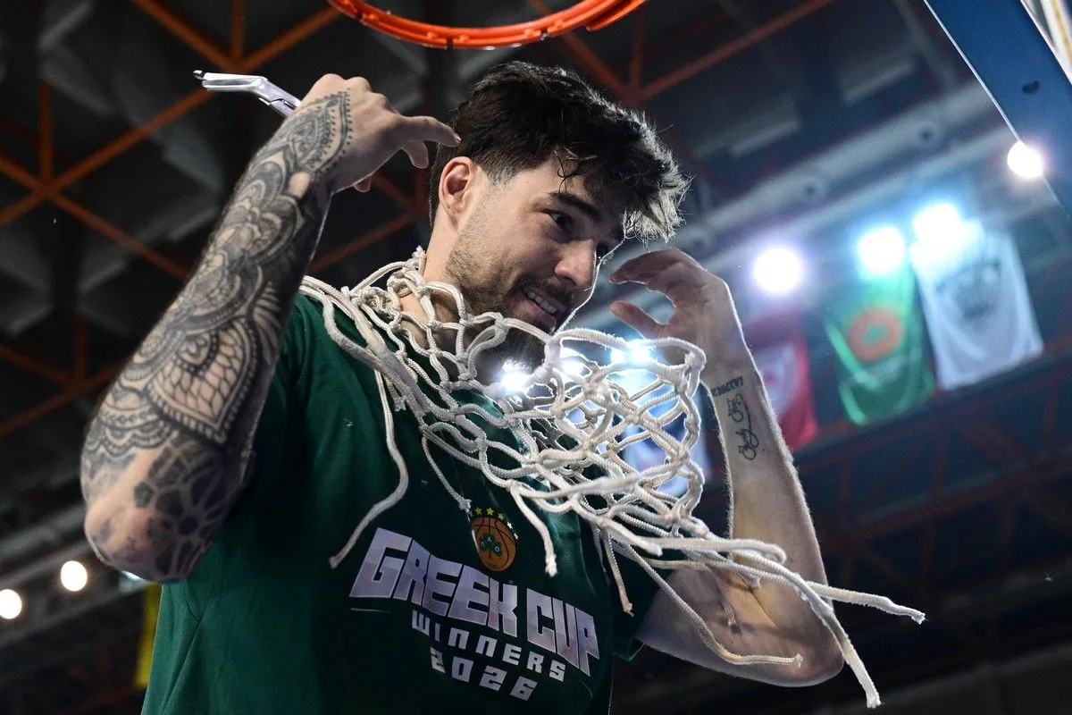Ο Χουάντσο έκοψε και πήρε το διχτάκι από τη μία μπασκέτα του τελικού του Allwyn Final 8 μετά την κατάκτηση του Κυπέλλου Ελλάδας Μπάσκετ από τον Παναθηναϊκό AKTOR.