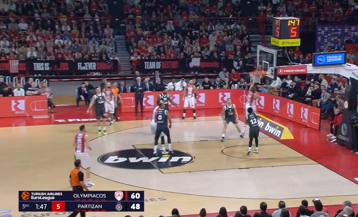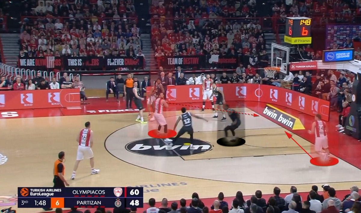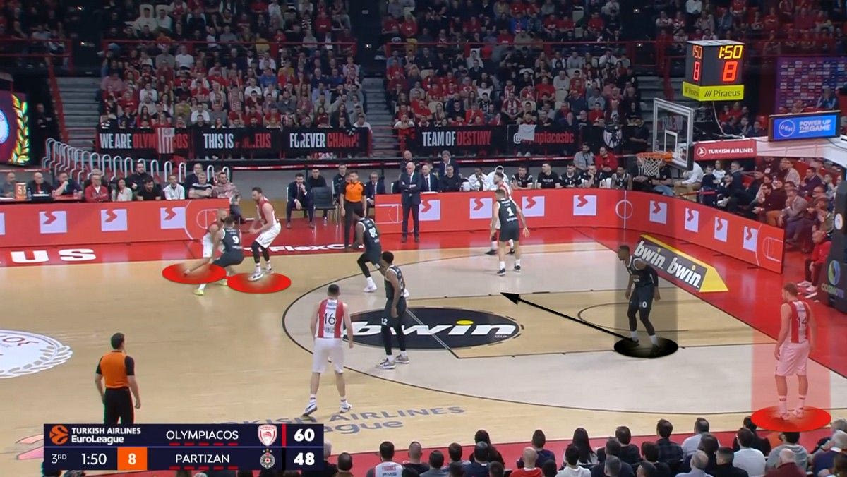 Η συγκεκριμένη φάση είναι από τον αγώνα με την Παρτίζαν και έχει το ενδιαφέρον της για πολλούς λόγους, με τον κυριότερο να είναι ότι η σερβική ομάδα έχει επιλέξει να αμυνθεί στο Pick and Roll όπως και ο Παναθηναϊκός AKTOR, δηλαδή με Hedge Out, με τον Ολυμπιακό να βρίσκει την λύση. Τα πράγματα βέβαια δεν είναι τόσο απλά. Σε αντίθεση με την Παρτίζαν για παράδειγμα, στον Παναθηναϊκό AKTOR ο παίκτης που αμύνεται στις 45 μοίρες θα είχε ήδη κλείσει στον Μιλουτίνοβ και δεν θα του έδινε τόσο χώρο. Υπάρχουν όμως ομοιότητες.