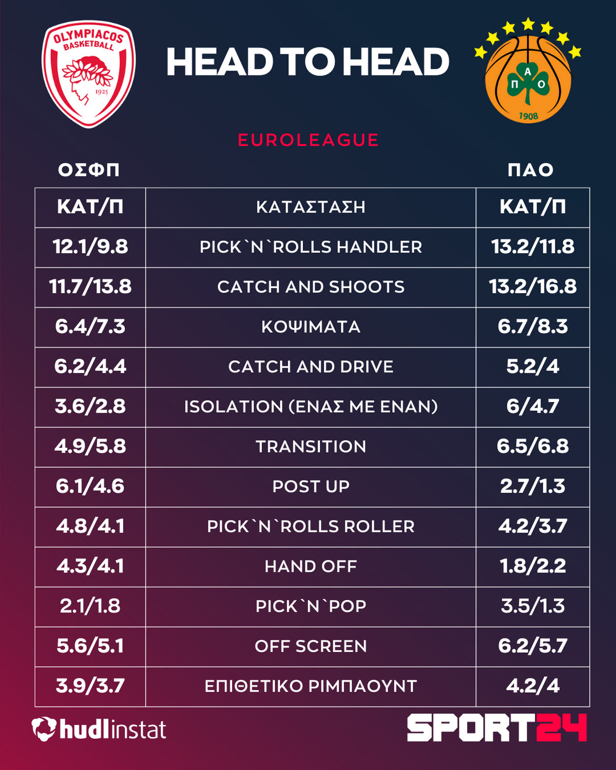 Το γεγονός αυτό είναι που κάνει ακόμα πιο σημαντικό το πώς θα συμπεριφερθούν οι δύο ομάδες στα Pick and Roll των “πράσινων” γκαρντ. Σύμφωνα με το Hudl Instat, ο Ολυμπιακός είναι μία από τις κορυφαίες ομάδες στην EuroLeague στην άμυνα στο Pick and Roll. Ο Παναθηναϊκός AKTOR ομως είναι η 2η καλύτερη ομάδα στην διοργάνωση (εμετά την Μπάγερν) στους πόντους ανά κατοχή σε κατάσταση Pick and Roll όπου την προσπάθεια παίρνει ο χειριστής της μπάλας.
