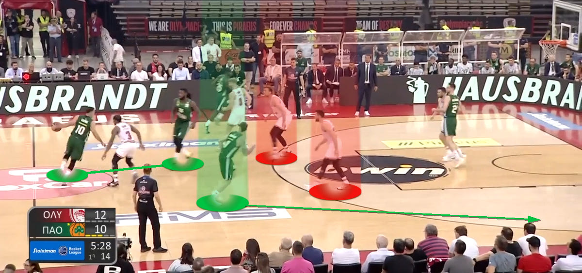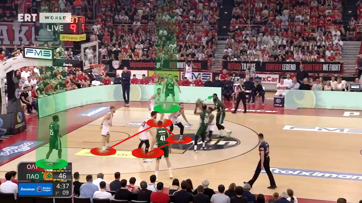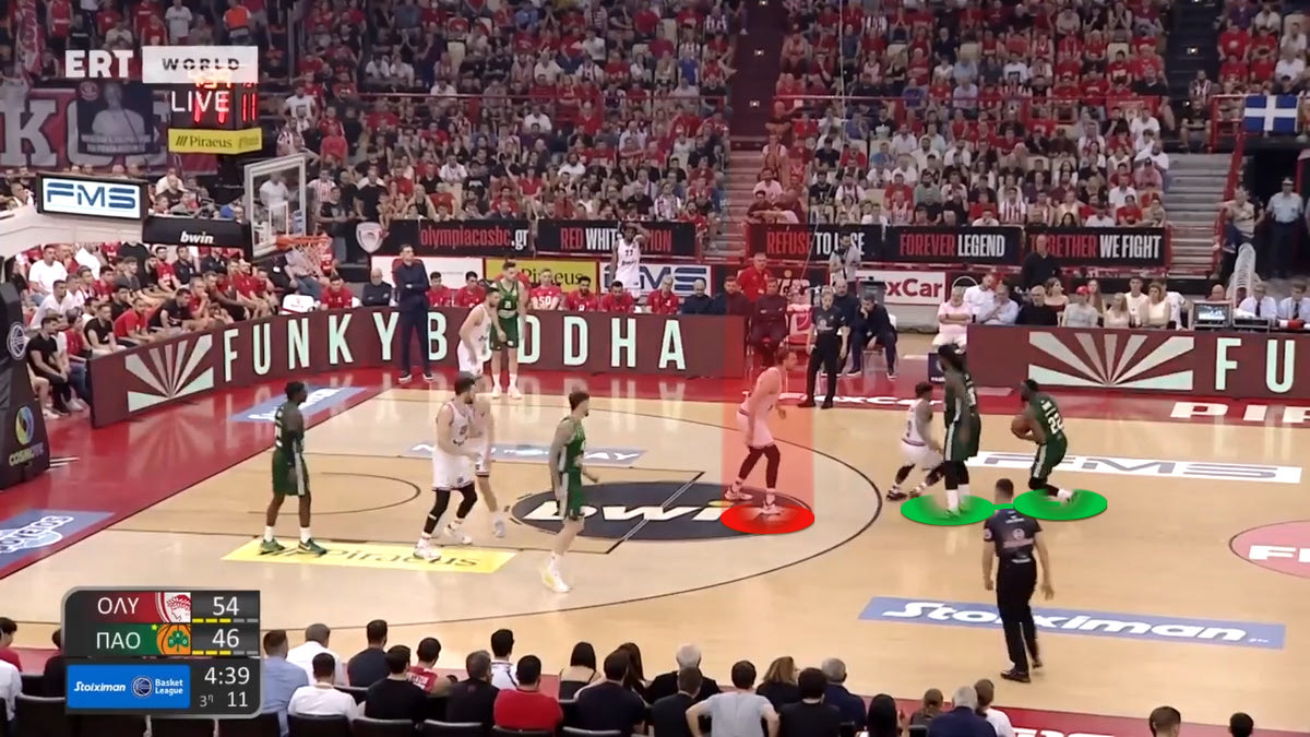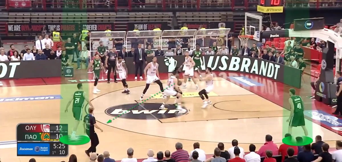 Στο ξεκίνημα ωστόσο φάνηκε να πληρώνουν μία επιλογή τους στην άμυνα. Συγκεκριμένα, στα Pick and Roll του Παναθηναϊκού AKTOR ο Μιλουτίνοβ έπαιζε μεν High Flat (δίνοντας το σουτ), ωστόσο την ίδια στιγμή στο ρολάρισμα ερχόταν βοήθεια από την γωνία της αδύνατης πλευράς. Αυτό δημιούργησε θέματα, με τους “πράσινους” ψηλούς να κάνουν Short Roll και να πασάρουν γρήγορα στην περιφέρεια, βγάζοντας ελεύθερα σουτ. Ιδού ένα παράδειγμα: