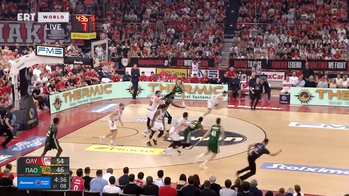 Ο Γκραντ μπαίνει πιο μέσα, με τον Μιλουτίνοβ να είναι ανάμεσα σε αυτόν και τον Λεσόρ. Οι άλλοι παίκτες του Ολυμπιακού έχουν κλείσει χώρους, αλλά δεν δίνουν βοήθεια στο ρολάρισμα του Λεσόρ. Ο Γκραντ πασάρει στον Λεσόρ.