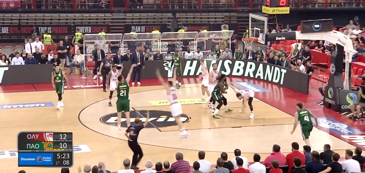 Οι “ερυθρόλευκοι” θέλησαν να αποτρέψουν τον Παναθηναϊκό AKTOR από το να βρει ελεύθερα τρίποντα και να αποκτήσει ρυθμό είτε με τα σουτ, είτε με κυκλοφορία της μπάλας. Πήγαν έτσι στην λογική του Game 1, όπου απέφευγαν να δίνουν βοήθειες στο Pick and Roll. Μάρκαραν δηλαδή την κατάσταση “2 με 2”, με τον Μιλουτίνοβ να πηγαίνει πιο πίσω, παίζοντας ουσιαστικά Drop. Ιδού ένα παράδειγμα: