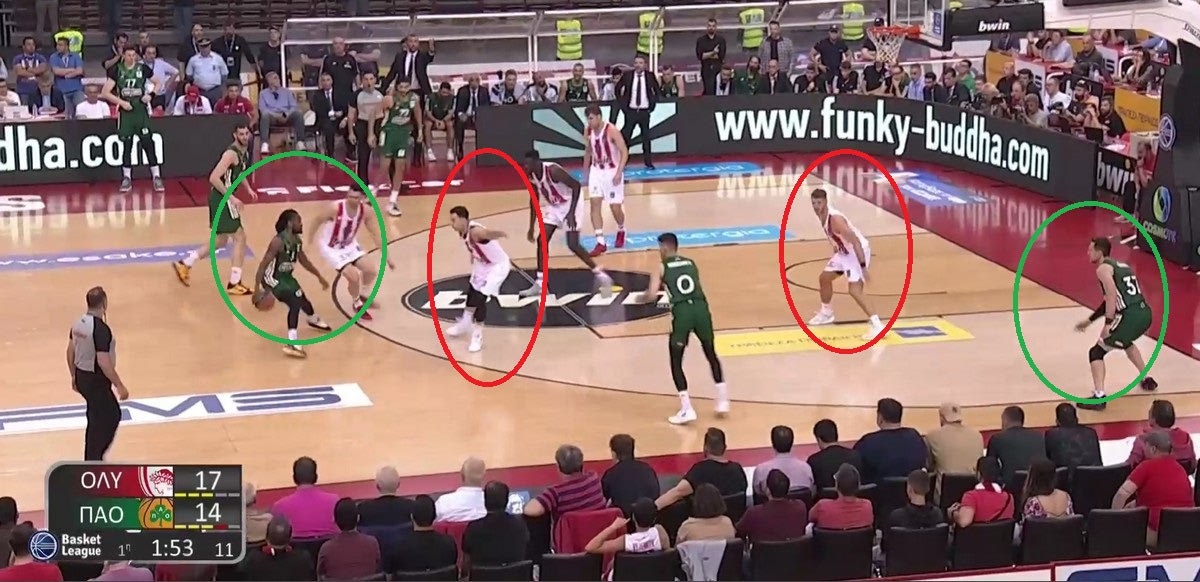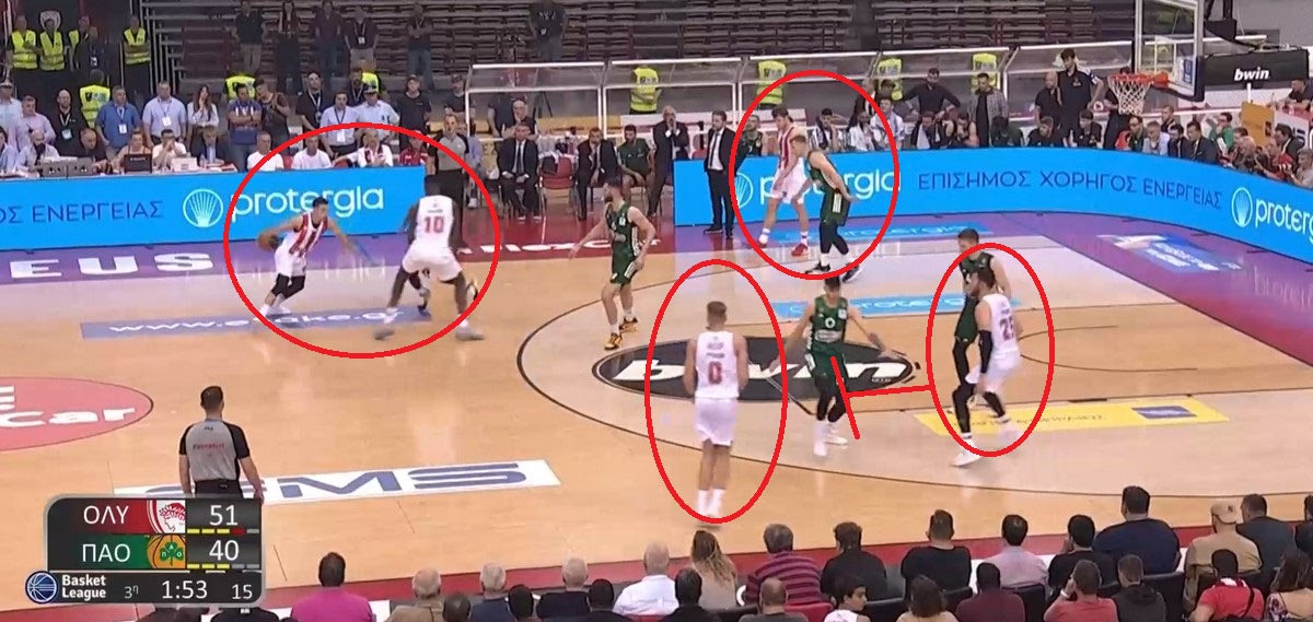 Ο Ολυμπιακός είχε κλειδώσει τον Αμερικανό και την επίθεση του Παναθηναϊκού. Την ίδια στιγμή, σε όλους τους άλλους γκαρντ των “πράσινων” εφάρμοσε η λογική των αλλαγών σε όλα τα σκριν. Ο λόγος; Κανένας παίκτης των “πράσινων” δεν έχει κάθετο παιχνίδι, άρα δεν θα μπορούσε να τρυπήσει την άμυνα των “ερυθρόλευκων”.