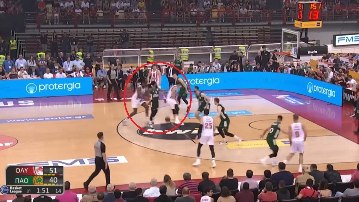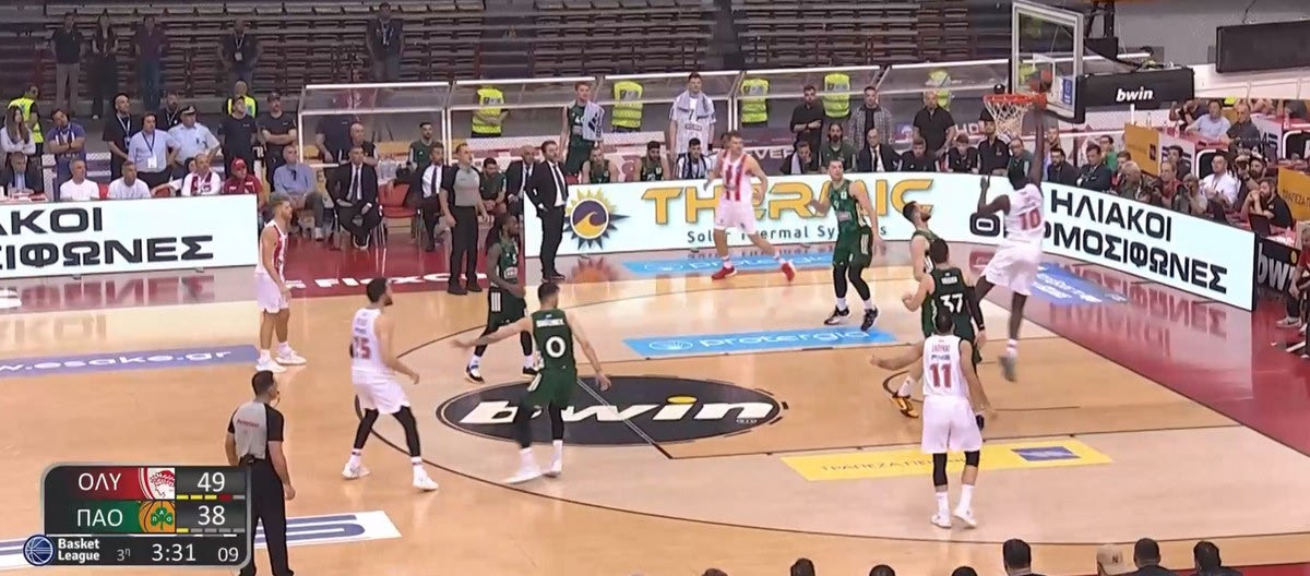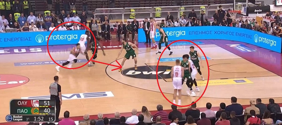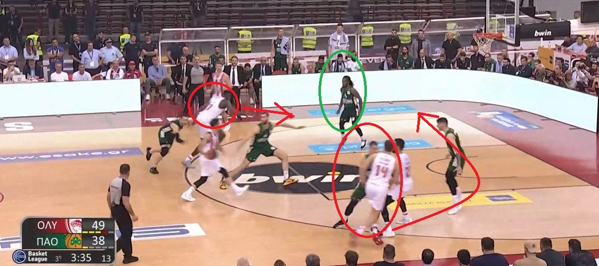 Ιδού μία φάση που το έδειξε αυτό, με τον Ολυμπιακό να κλείνει τον Λι, που πάσαρε στον Γκριγκόνις, με τον Λιθουανό να δέχεται τάπα όταν πήγε προς το καλάθι: