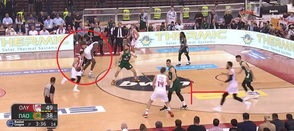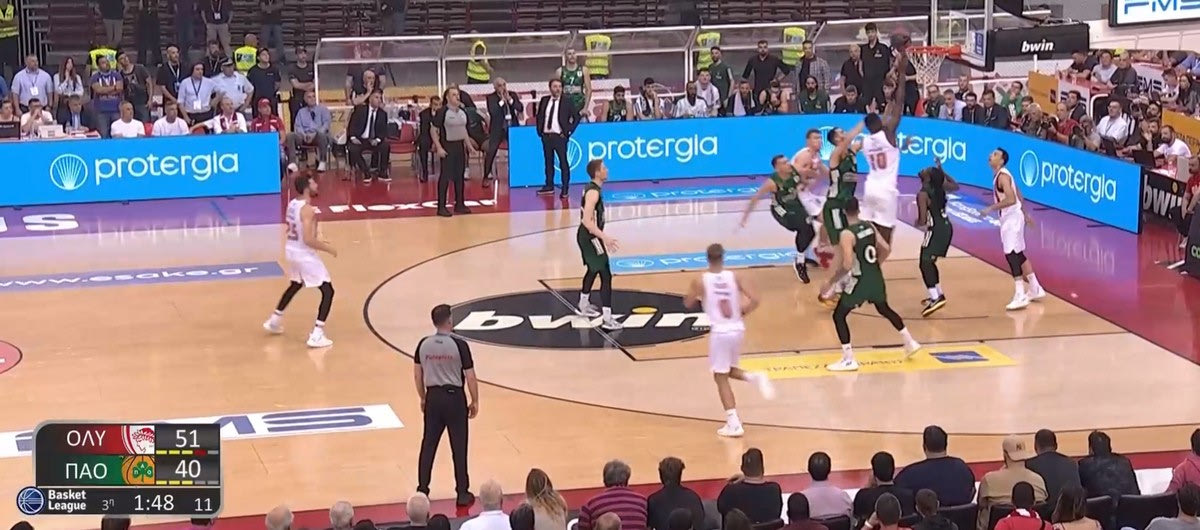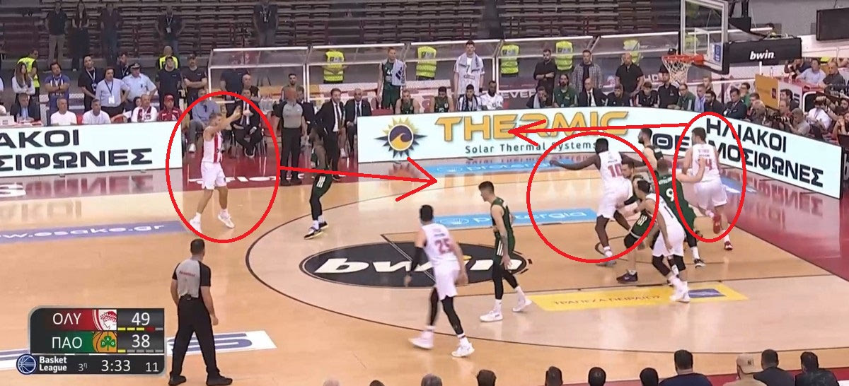 Ο Ολυμπιακός χτίζει το τείχος του, με τον Παπανικολάου και τον Σλούκα να κλείνουν τον Λι, ενώ και ο Γουόκαπ είναι μέσα στην ρακέτα, αφήνοντας ελεύθερο τον Πονίτκα.