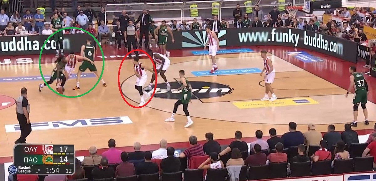 Ο Σλούκας πασάρει στον Φαλ, που ετοιμάζεται να ποστάρει τον Παπαγιάννη, ενώ ο Παναθηναϊκός δεν μπορεί να δώσει βοήθειες, αφού πρέπει να έχει υπόψη τους σουτέρ των “ερυθρόλευκων”.