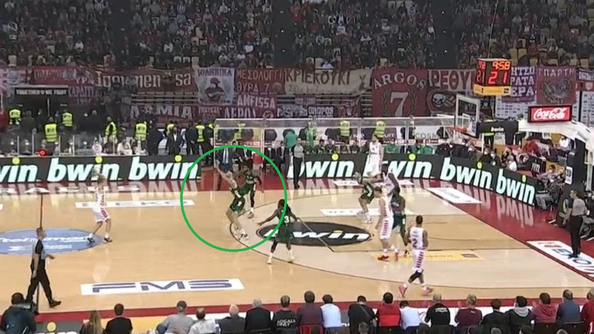 Γιατί όμως το έκανε αυτό ο Παναθηναϊκός; Για να δώσει μέγεθος στην περιφέρειά του. Έχοντας κοντούς γκαρντ, ο Δημήτρης Πρίφτης εφάρμοσε την ζώνη για να σβήσει αυτό το πρόβλημα και ανέβασε τον Παπαγιάννη πιο ψηλά για να κερδίσει σε μέγεθος. Έχοντας πλέον καθυστερήσει την επίθεση του Ολυμπιακού και παίζοντας με το “μυαλό” των γκαρντ των “ερυθρόλευκων”, στην συνέχεια άφηνε συχνά τον Παπαγιάννη να μαρκάρει στο ποστ τον Φαλ, δίνοντας βοήθεια από τις γωνίες.