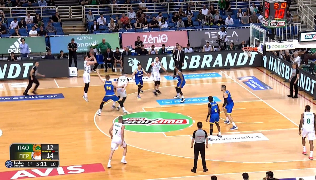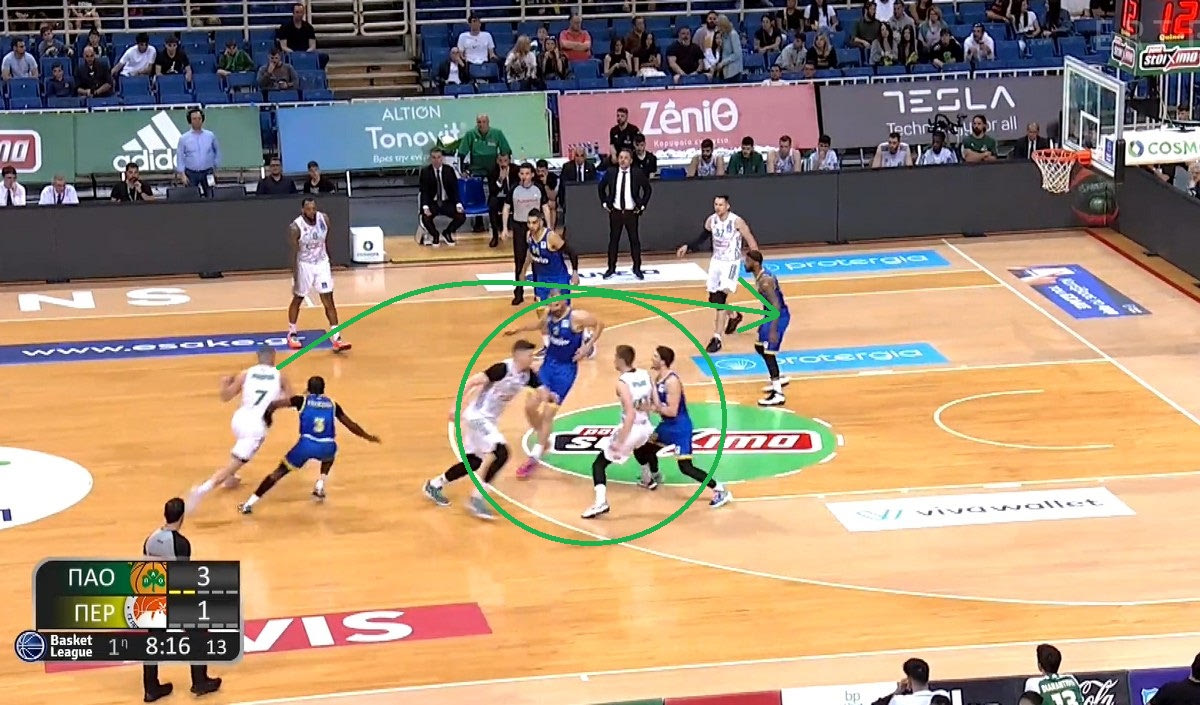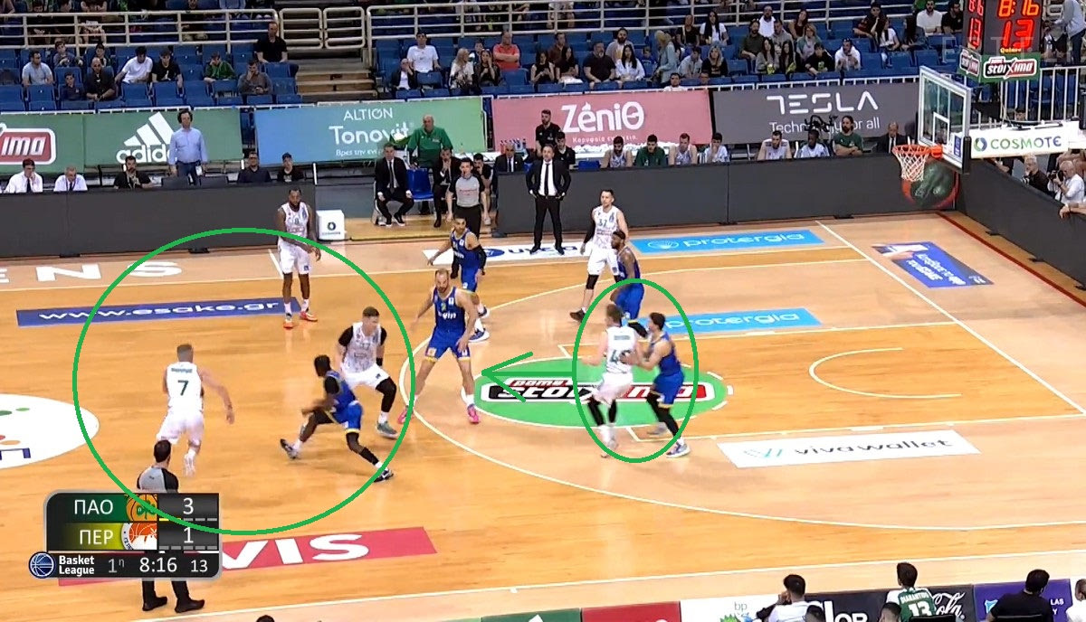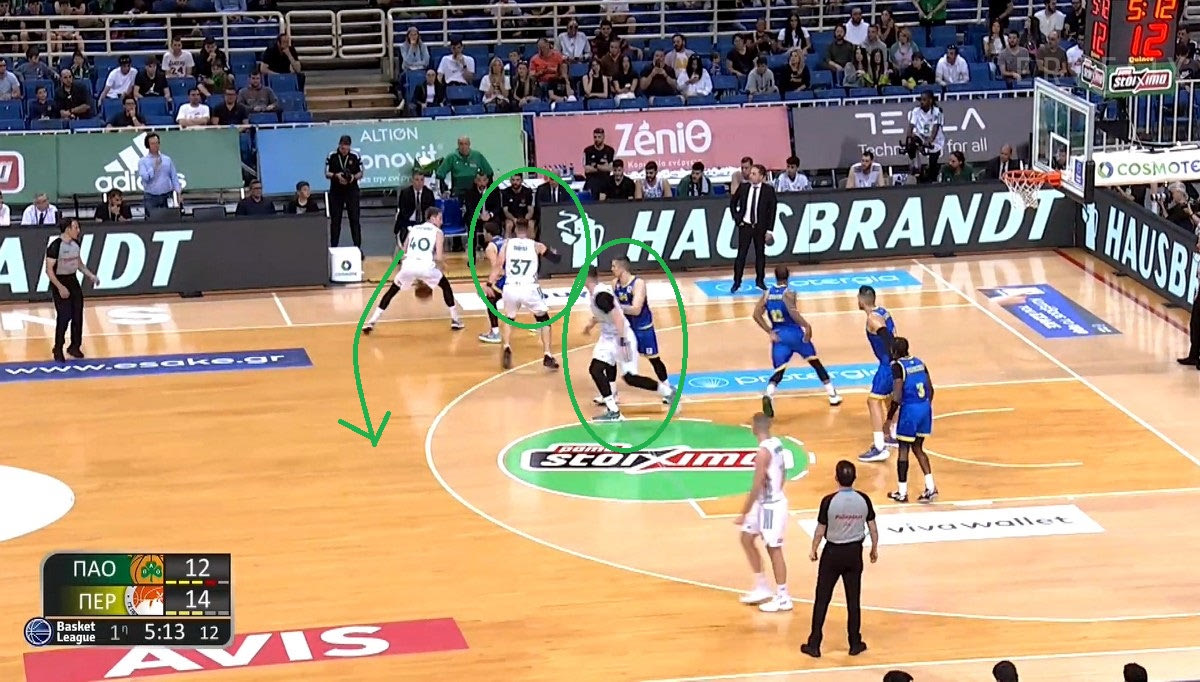 Την ίδια στιγμή οι “πράσινοι” πρέπει να διαχειριστούν ότι ο Ολυμπιακός αμύνεται διαφορετικά στο Pick and Roll από το Περιστέρι bwin. Οι “πρίγκιπες” συνηθίζουν να παίζουν με δυναμικό hedge out, κάτι που έδινε ευκαιρία στους “πράσινους” να επιτεθούν σε close out άμυνες και να χτυπήσουν τις αμυντικές περιστροφές της ομάδας του Βασίλη Σπανούλη. Ο Ολυμπιακός όμως αμύνεται κυρίως με Flat (ο ψηλός μένει λίγο πιο πίσω, δίνοντας το σουτ) και αλλαγές.