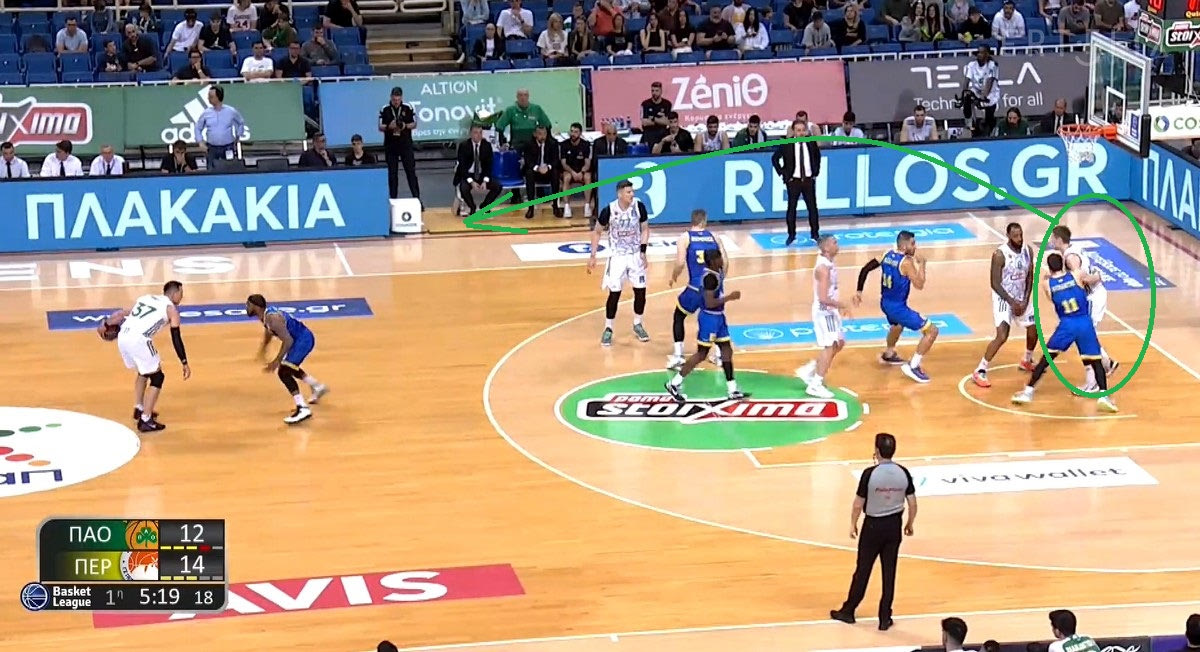 Ο Μποχωρίδης στήνει Pick and Roll με τον Γκουντάιτις, ενώ ο Γκριγκόνις ανεβαίνει για να δώσει back σκριν στον δυναμικό σέντερ.