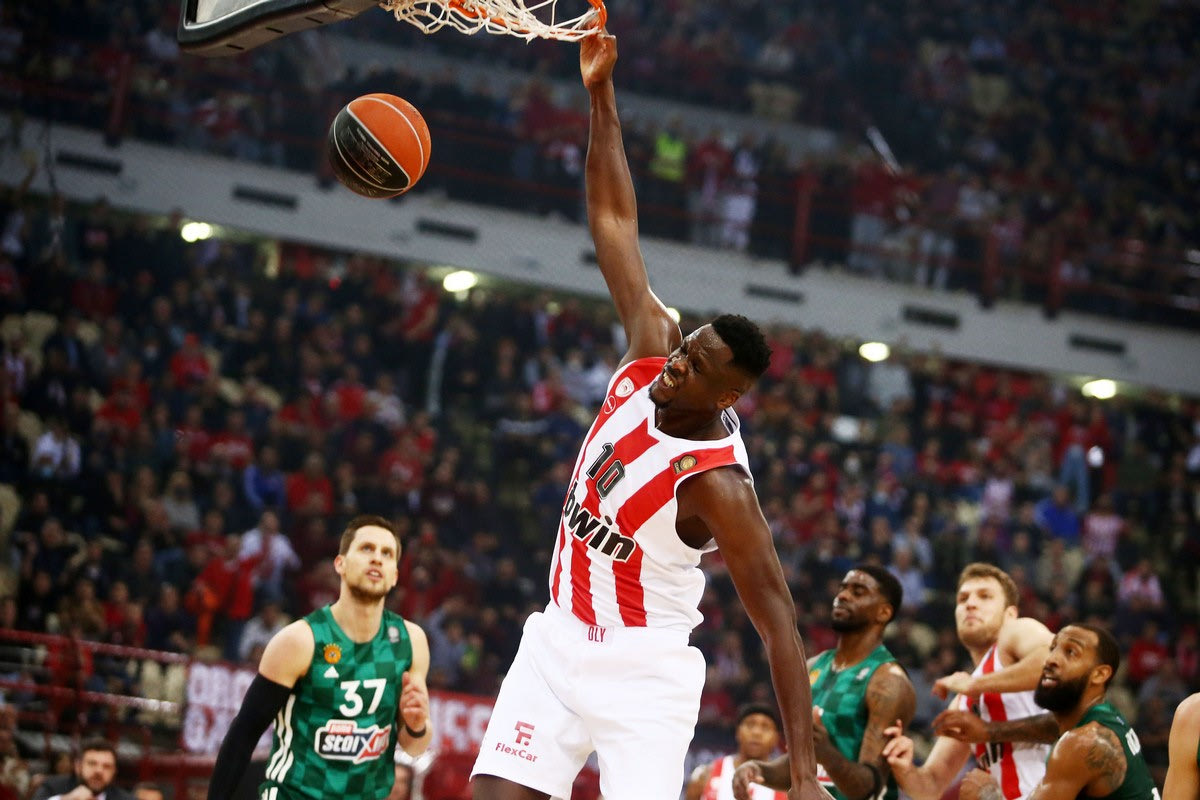 Ο Μουσταφά Φαλ καρφώνει την μπάλα σε αγώνα του Ολυμπιακού με τον Παναθηναϊκό Intime