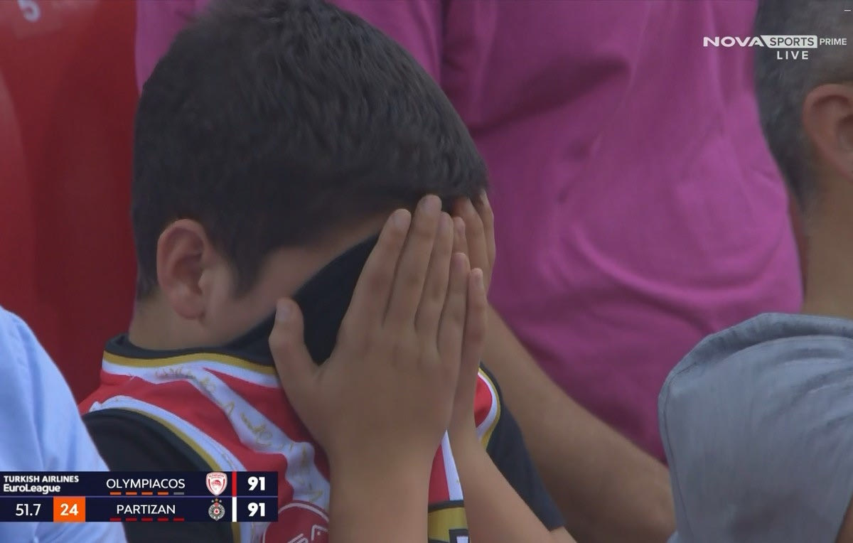 Η αγωνία χτύπησε στο κόκκινο στο ΣΕΦ στην παράταση με τους μικρούς φίλους του Ολυμπιακού να μην μπορούν ούτε να δουν τις βολές του Νίκολα Μιλουτίνοβ.