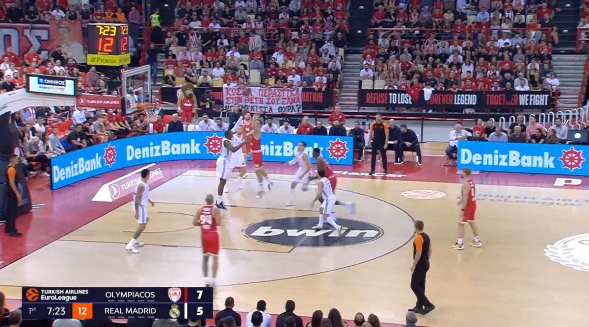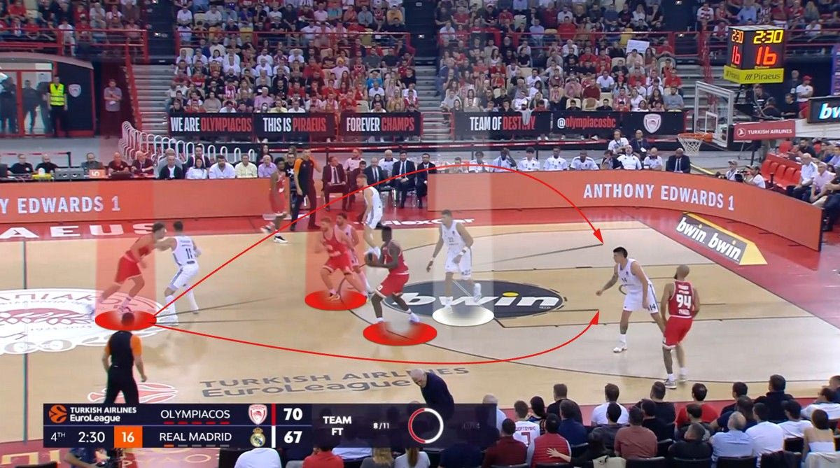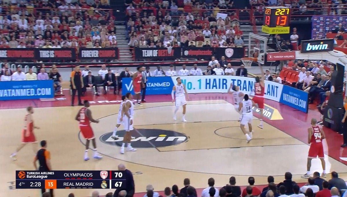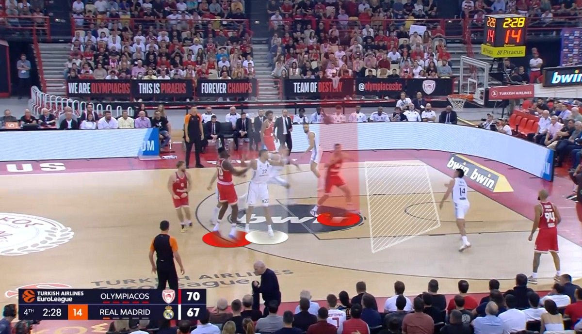 Οι “ερυθρόλευκοι” έβγαλαν τους Μαδριλένους από το παιχνίδι τους, που έβρισκαν λύσεις κυρίως στο transition. Σύμφωνα με το Hudl Instat, οι Μαδριλένοι είχαν 9/14 σουτ (5/6 δίποντα, 4/8 τρίποντα) σε επιθέσεις που πήραν στα πρώτα 8 δευτερόλεπτα της επίθεσης και μόλις 14/41 σουτ (7/18 δίποντα, 7/23 τρίποντα) σε επιθέσεις που πήραν μετά το 9ο δευτερόλεπτο, σε καταστάσεις σετ γηπέδου δηλαδή, που η άμυνα του Ολυμπιακού είχε οργανωθεί. Αυτό λέει πολλά.