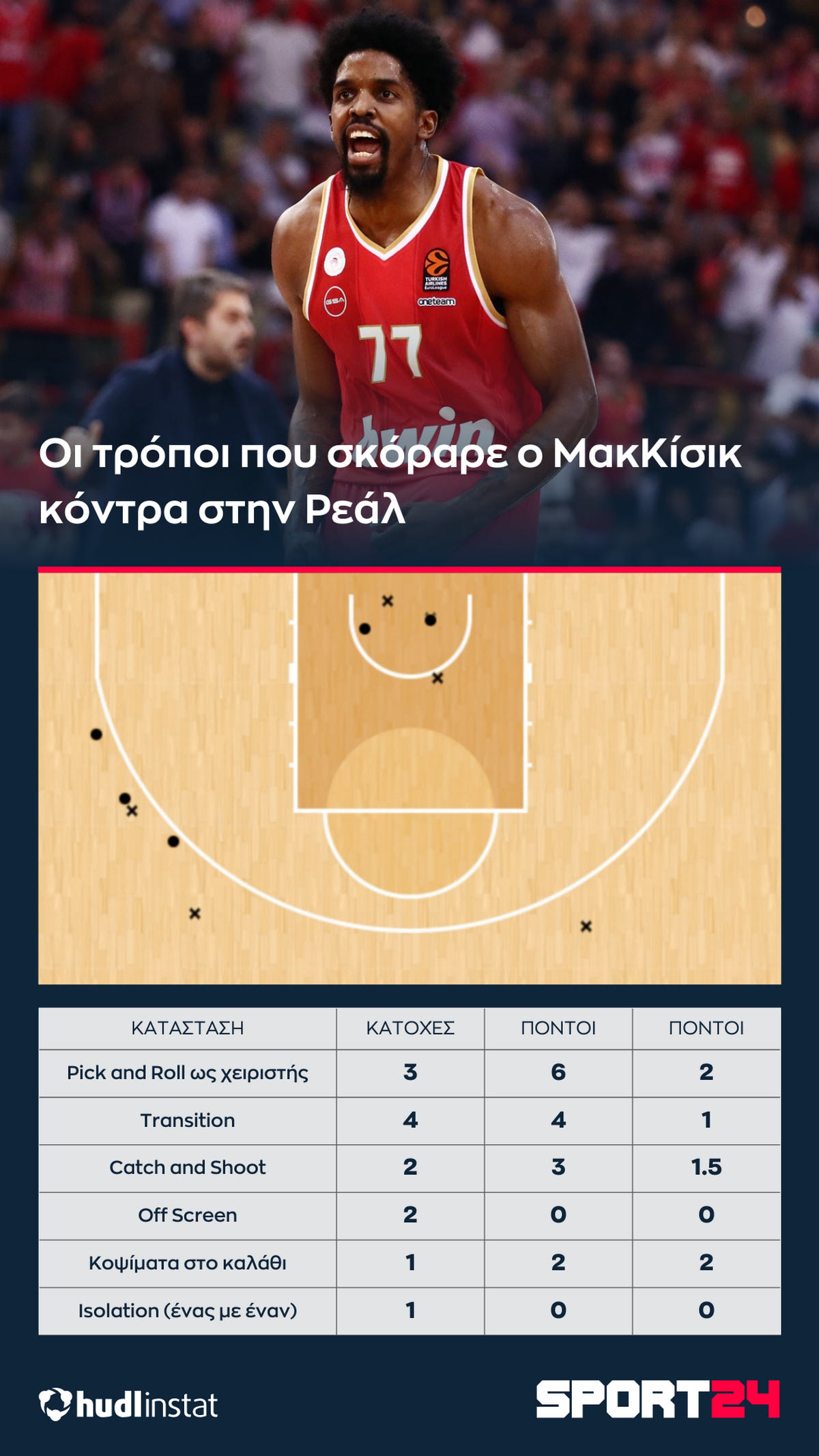 Ο ΜακΚίσικ έχει τον ρόλο του ξυπνητηριού για τον Ολυμπιακό. Αυτό έκανε και κόντρα στην Ρεάλ, τόσο στην 2η περίοδο, όσο και στην 4η, όταν ξύπνησε τους “ερυθρολεύκους” με το κάθετο παιχνίδι του και το τρέξιμό του στο ανοιχτό γήπεδο, ενώ έβαλε και μεγάλα σουτ.