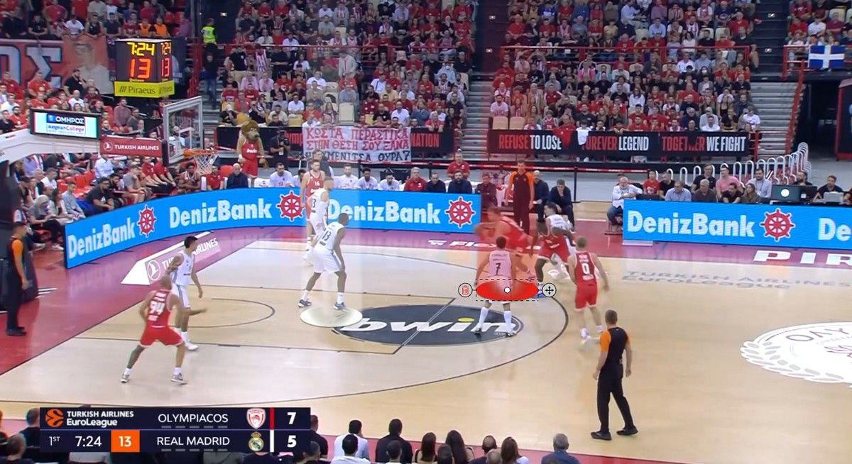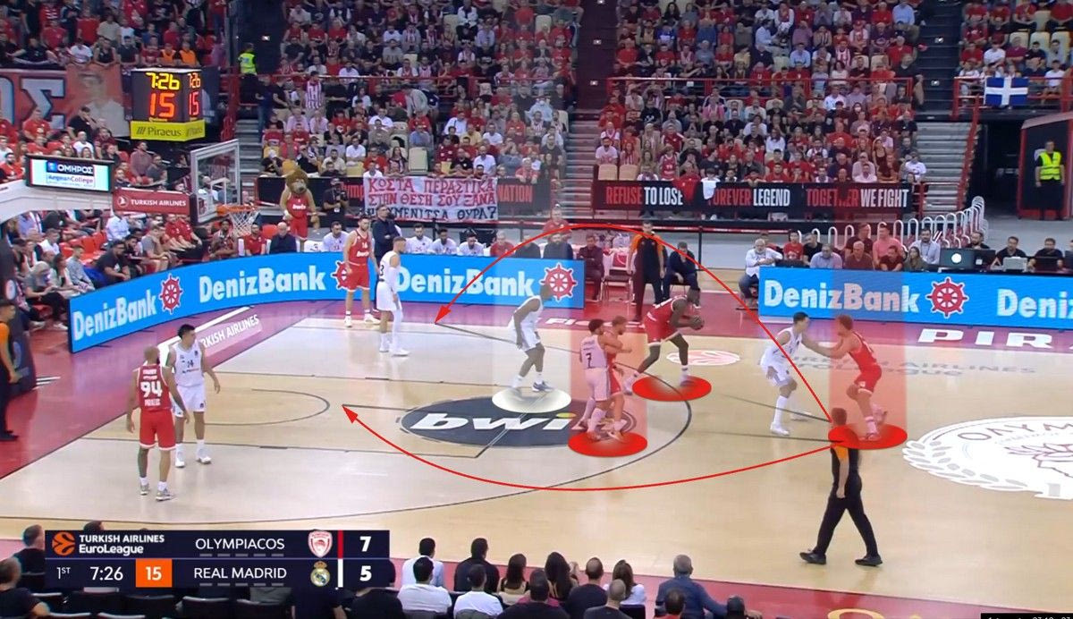 Ο Βεζένκοβ θα μπορούσε και να σουτάρει σε αυτή τη φάση. Επέλεξε το drive. Το θέμα είναι πλέον ότι η Ρεάλ έχει υπόψη ότι ο Βεζένκοβ μπορεί να το κάνει αυτό. Θέλει να το αποτρέψει. Σε μία από τις κρισιμότερες φάσεις του αγώνα λοιπόν, ο Ολυμπιακός έπαιξε το ίδιο play, αλλά με διαφορετική κατάληξη. Ιδού: