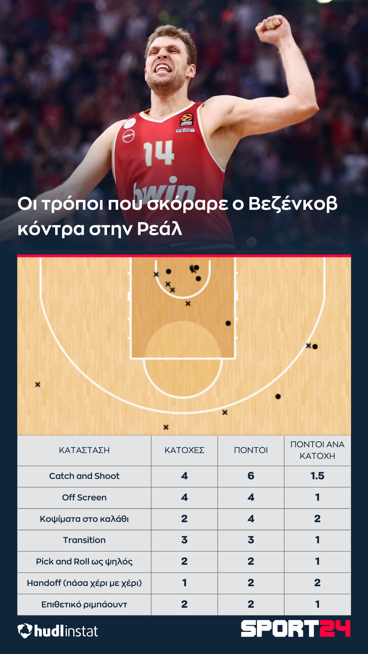 Με κυκλάκι τα εύστοχα σουτ, με “x” τα άστοχα