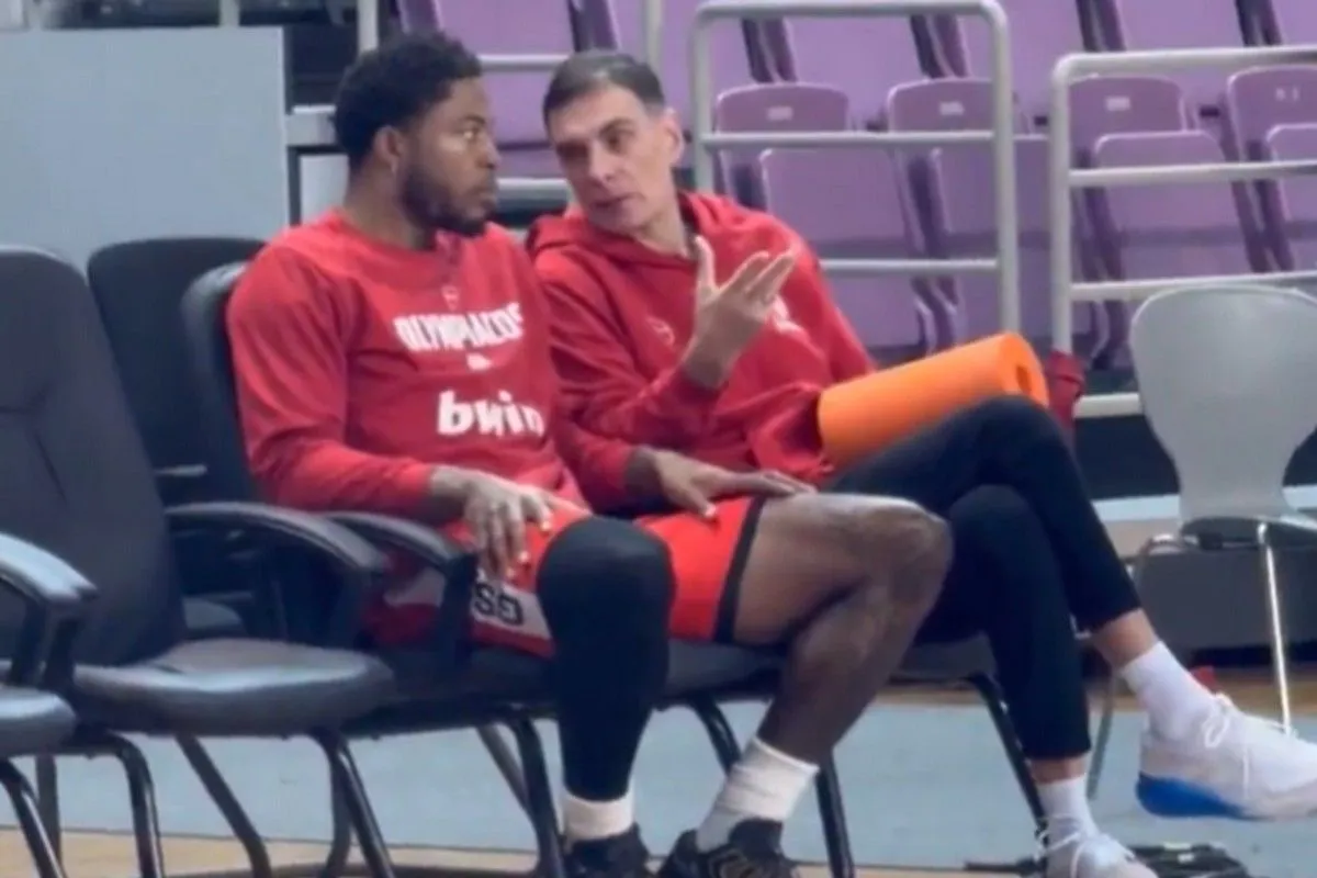 Η συζήτηση του Γιώργου Μπαρτζώκα με τον Ταϊρίκ Τζόουνς κατά την προπόνηση του Ολυμπιακού την Παρασκευή (20/2) κατά την προετοιμασία της ομάδας για τον τελικό του Allwyn Final 8 απέναντι στον Παναθηναϊκό AKTOR.