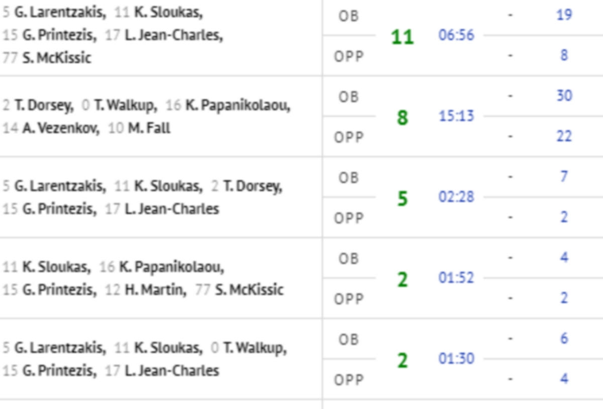 Ο Γιώργος Μπαρτζώκας χρησιμοποίησε μόνο δέκα διαφορετικά σχήματα στον νικηφόρο αγώνα με τη Ζάλγκιρις. Το πιο αποδοτικό εξ αυτών έμεινε λιγότερα από 7 λεπτά στο παρκέ. Αρκούσαν, όπως προκύπτει από τα στοιχεία που παρέχει το Instat Scout στο SPORT24.