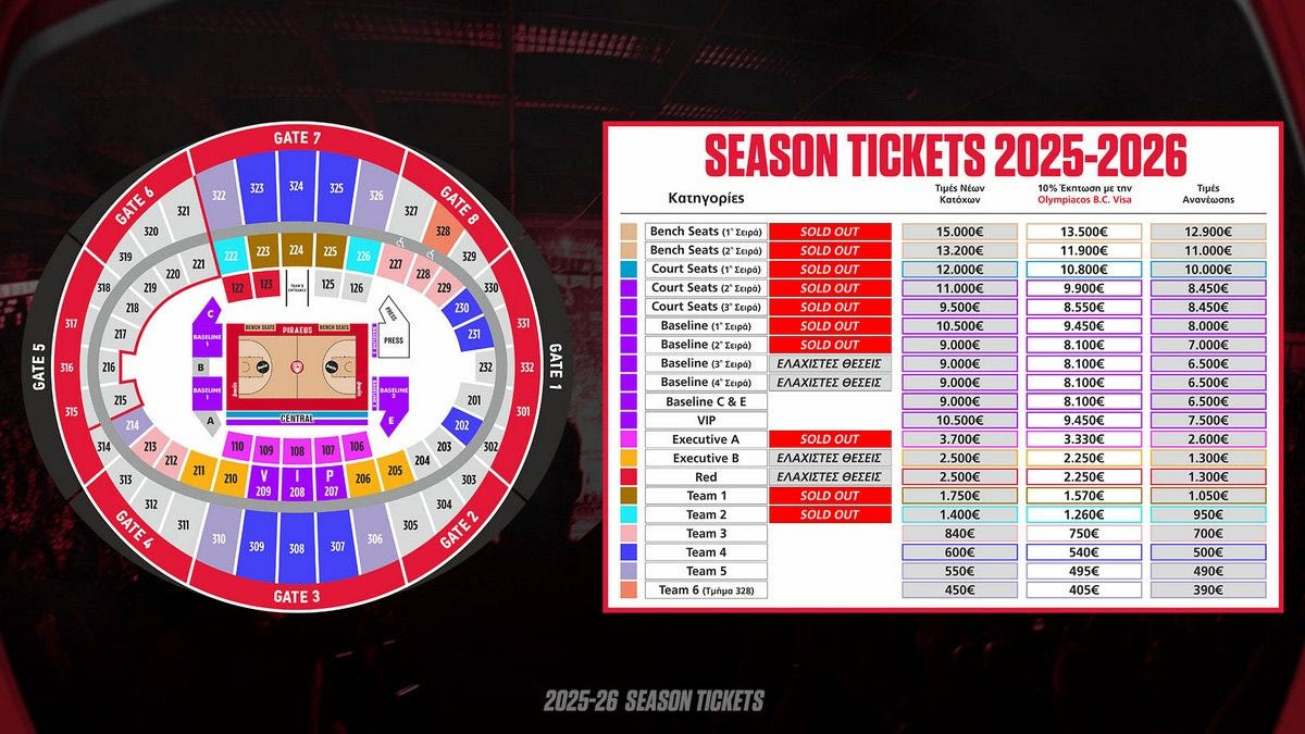 Οι τιμές για νέους κατόχους εκκινούν από 450 ευρώ και φτάνουν μέχρι τα 15.000 στις Bench Seats, ωστόσο αρκετά τμήματα του γηπέδου έχουν ήδη εξαντληθεί από τις ανανεώσεις, όπως προκύπτει από τον πίνακα που έδωσαν στην δημοσιότητα οι ερυθρόλευκοι.
