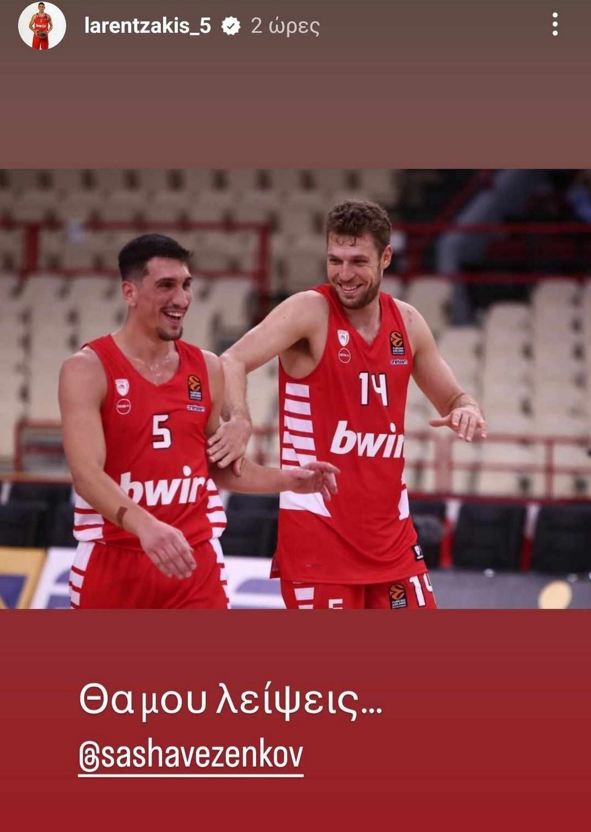 Το δικό του μήνυμα στον Σάσα Βεζένκοβ έστειλε ο συμπαίκτης του στον Ολυμπιακό, Γιαννούλης Λαρεντζάκης, τονίζοντας πως θα του λείψει, καθώς ο MVP της EuroLeague μετακομίζει στο Σακραμέντο για λογαριασμό των Κινγκς.