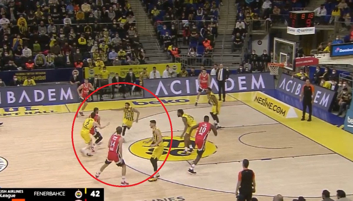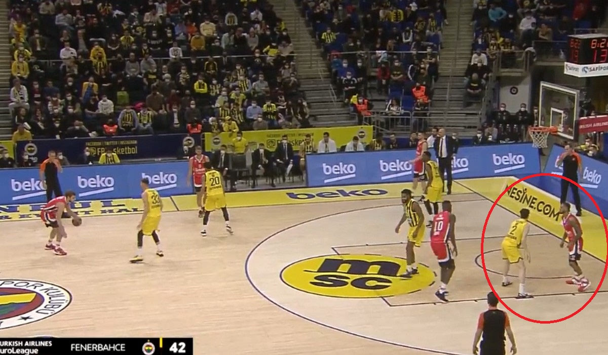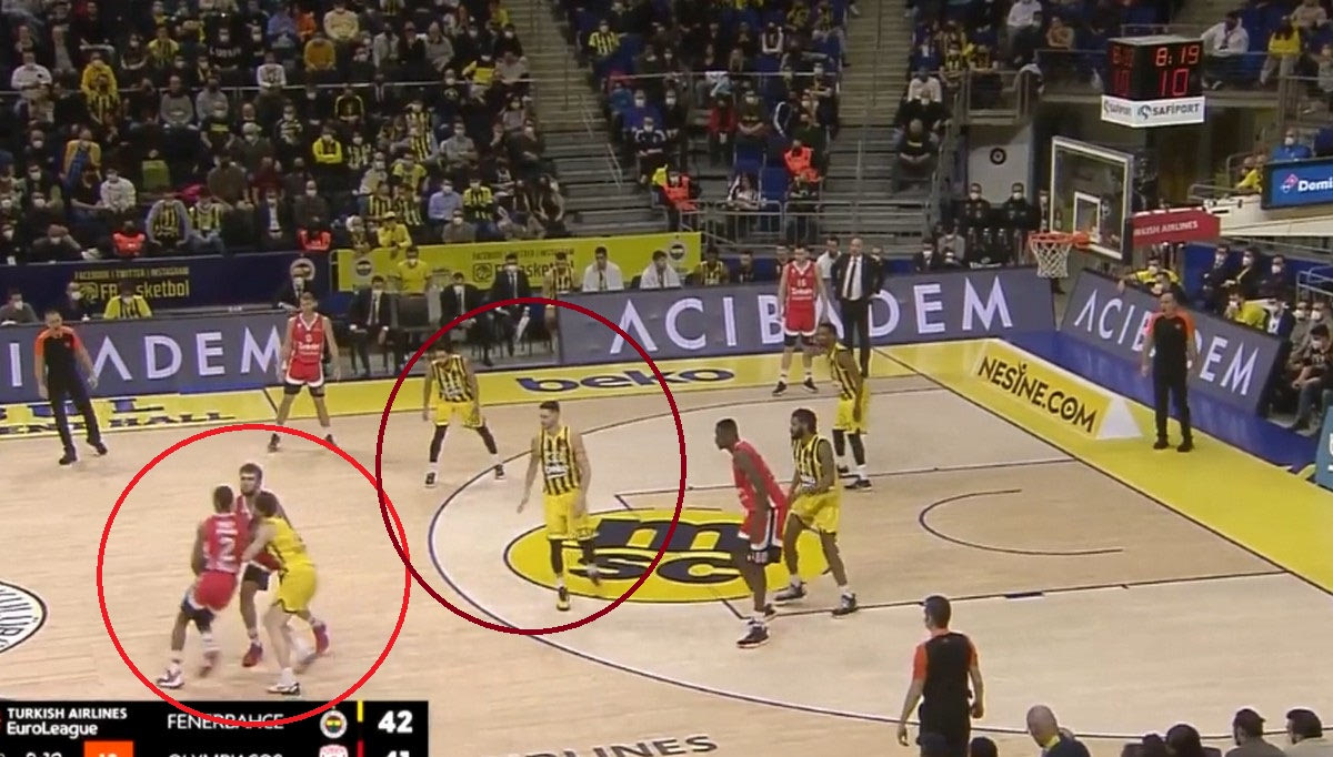 Η άμυνα της Φενέρ στον Ντόρσεϊ ξεκινούσε μακριά από την μπάλα, με τον αμυντικό που τον μάρκαρε να τον παίζει “Top-lock”, δηλαδή από μπροστά για να μην τον αφήσει να πάρει σκριν, κάτι που φαίνεται και σε αυτή την φωτογραφία: