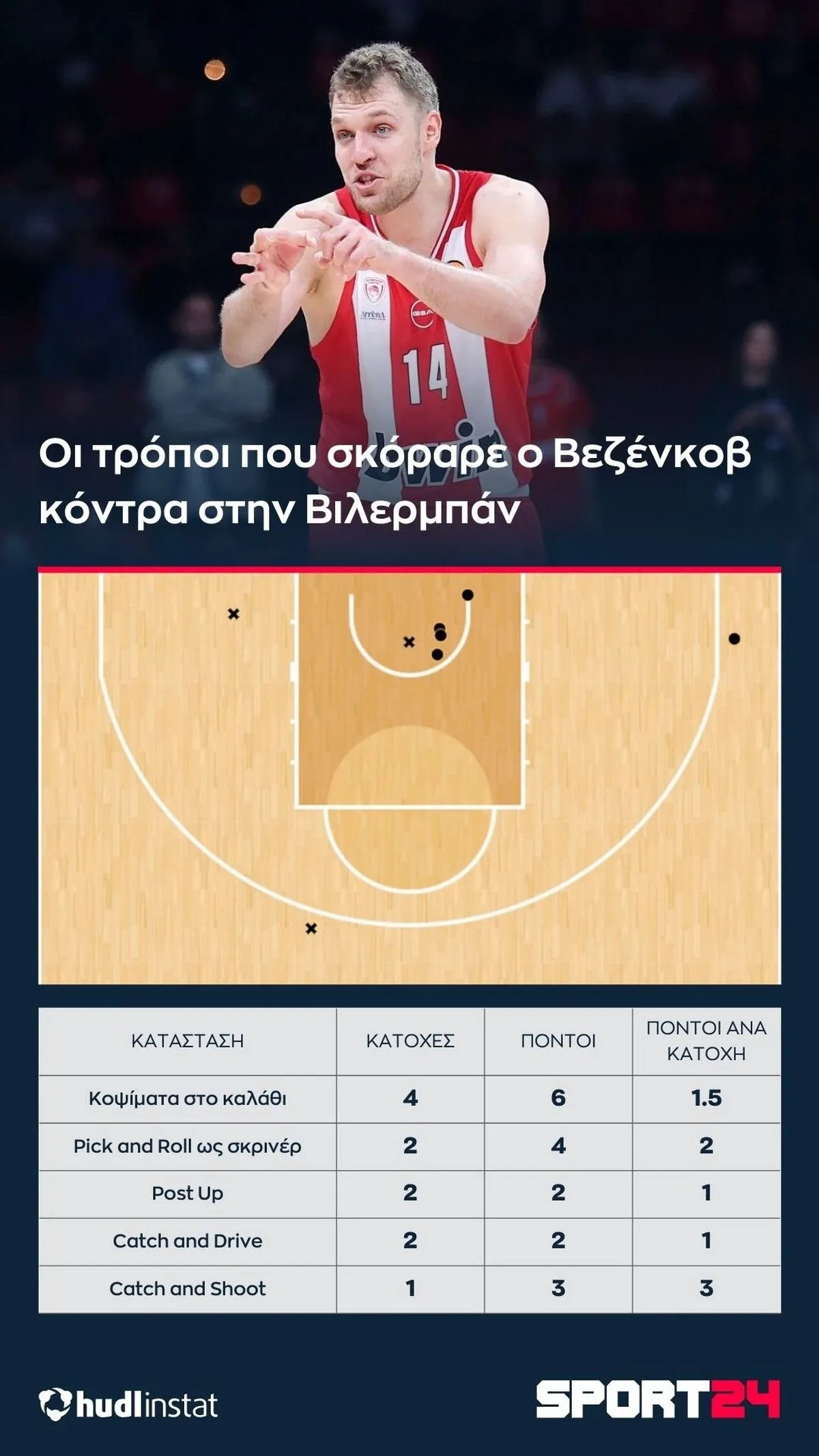 Ο Σάσα Βεζένκοβ έχει αρχίσει να ανεβάζει κατακόρυφα την απόδοσή του στα τελευταία παιχνίδια και κόντρα στην Βιλερμπάν είχε μία ακόμα μεστή εμφάνιση, τελειώνοντας τον αγώνα με 17 πόντους με 4/6 δίποντα, 1/2 τρίποντα και 6/6 βολές σε 30 λεπτά συμμετοχής, σκοράροντας με διάφορους τρόπους.