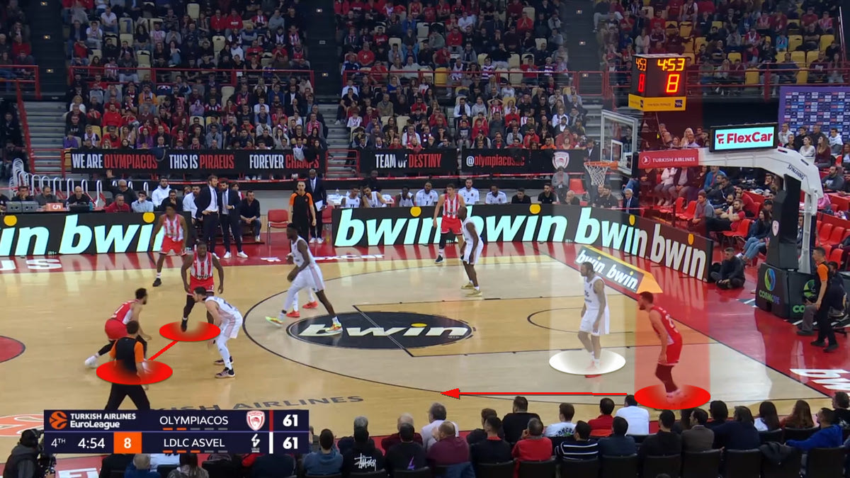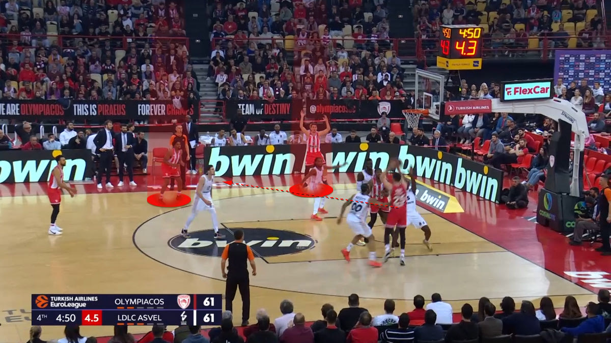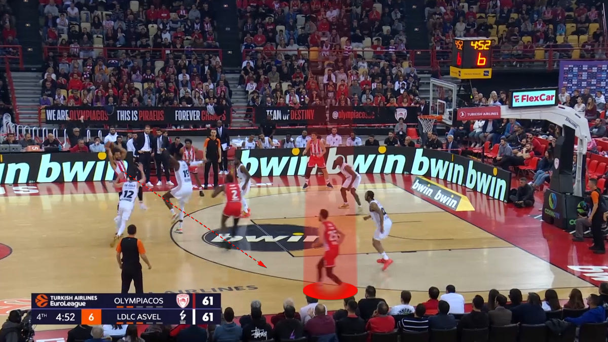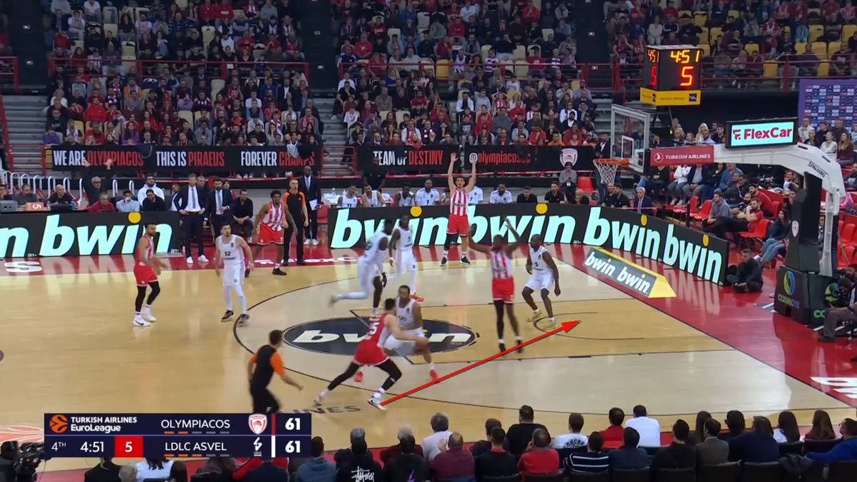 Ο Ολυμπιακός προσάρμοσε την άμυνά του στην 4η περίοδο. Ανέβασε την ενέργειά του. Επέλεξε να παίξει πιο ενεργά με αλλαγές στα Pick and Roll (ειδικά με τον Φαλ) και ζήτησε από τους γκαρντ του να παίζουν άμυνα από μπροστά το post, για να μην περνάει η πάσα στο “ζωγραφιστό”. Αυτή όμως ήταν απλώς η αρχή. Όπως κάθε φορά που μία ομάδα αμύνεται έτσι, ο παίκτης της αδύνατης πλευράς έπρεπε να πηγαίνει σε δώσει βοήθεια στο post όταν περνούσε η πάσα μέσα. Τότε ξεκίνησαν οι λάθος επιλογές των Γάλλων. Ιδού ένα παράδειγμα: