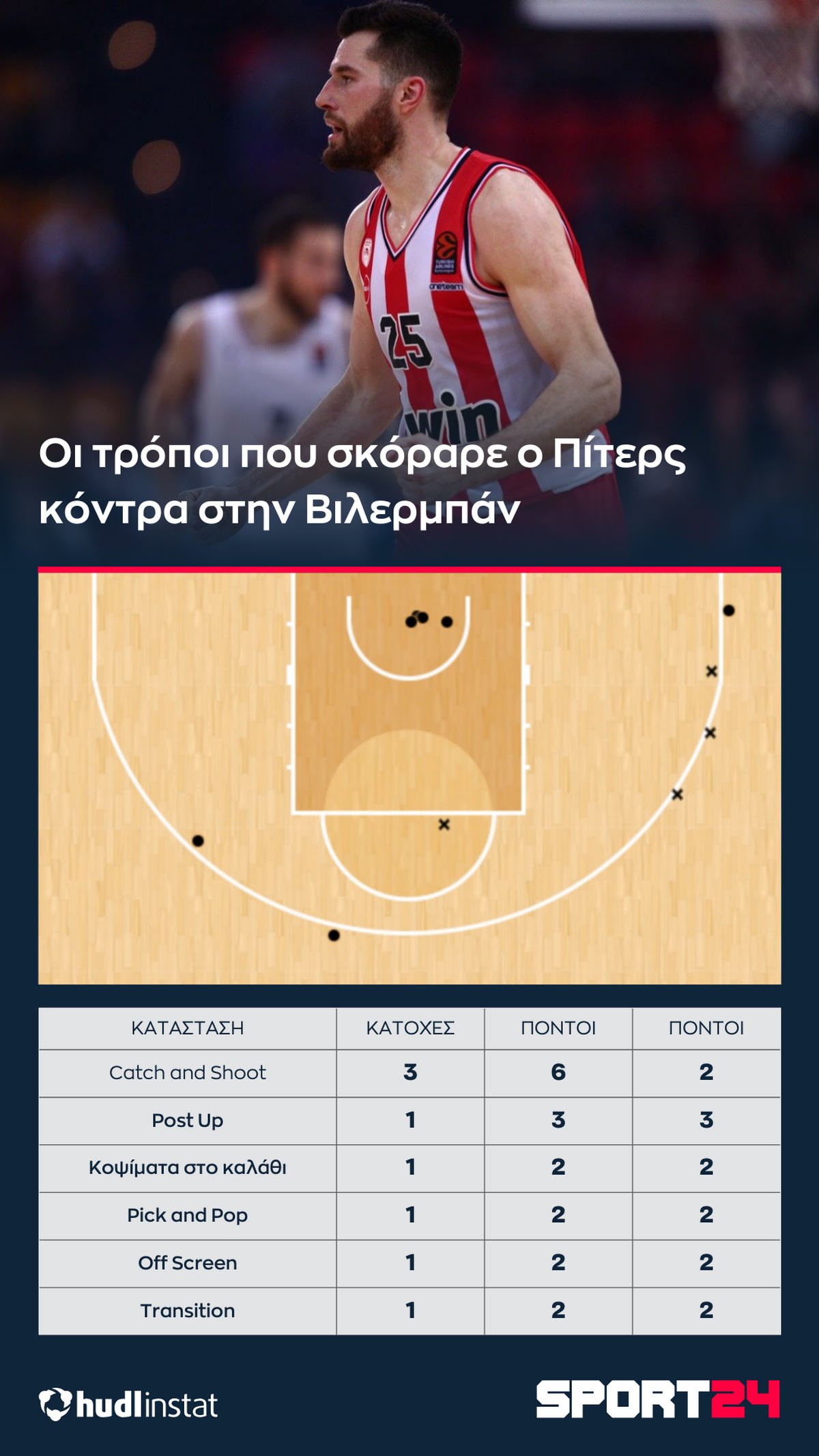 Ο Πίτερς παίζει το πιο ώριμο μπάσκετ της καριέρας του. Αυτό όμως φαίνεται κυρίως από φάσεις όπως αυτή που έκανε στην 1η ασίστ του, που έβαλε μπροστά τον Ολυμπιακό στο σκορ: