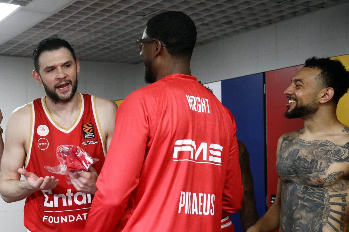 Ξέφρενοι πανηγυρισμοί στα αποδυτήρια του Ολυμπιακού, με τους παίκτες, το σταφ, τους προπονητές και τους διοικητικούς ηγέτες της ομάδας να το χαίρονται με την ψυχή τους.