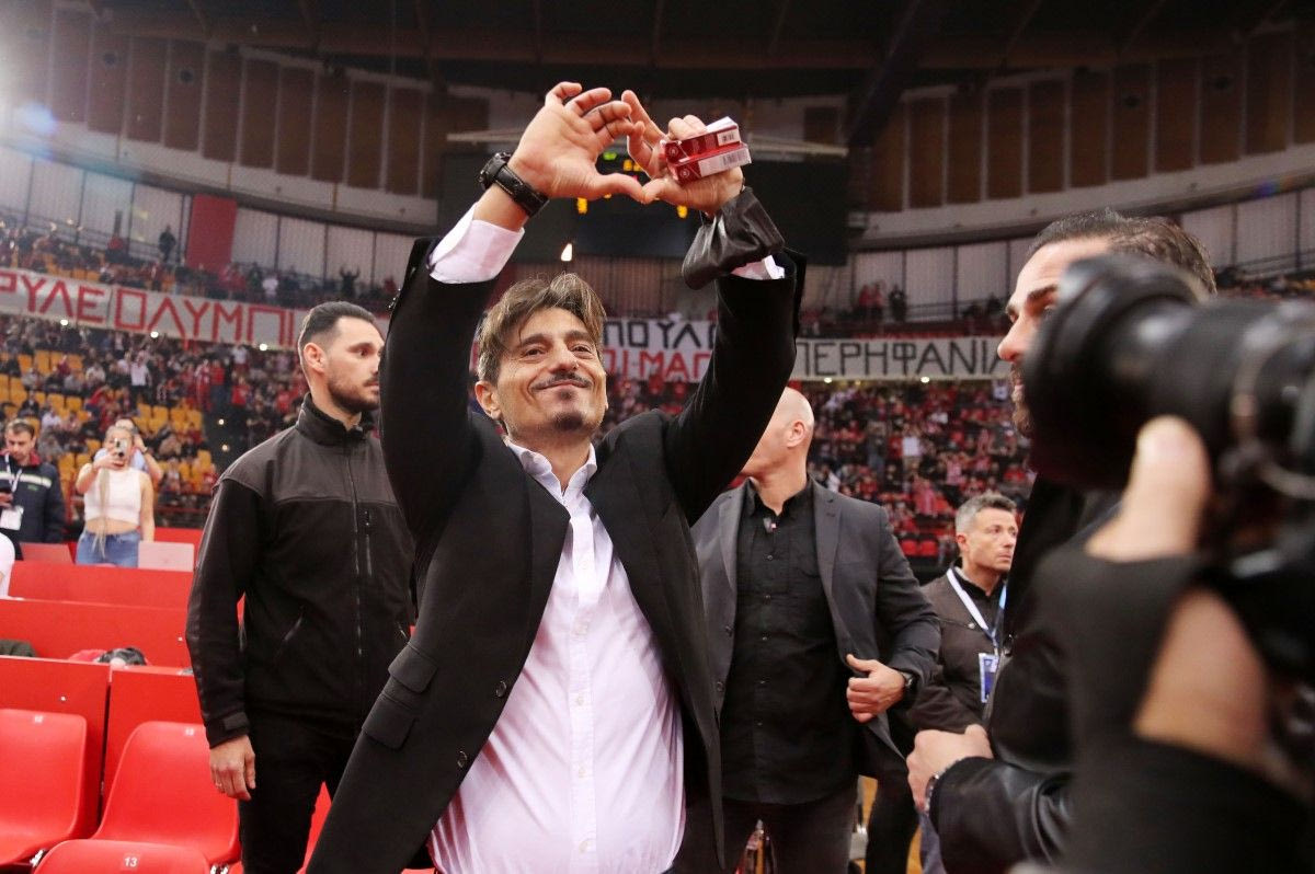 Ολυμπιακός – Παναθηναϊκός: Η είσοδος του Δημήτρη Γιαννακόπουλου στο παρκέ του ΣΕΦ κάνοντας καρδούλα