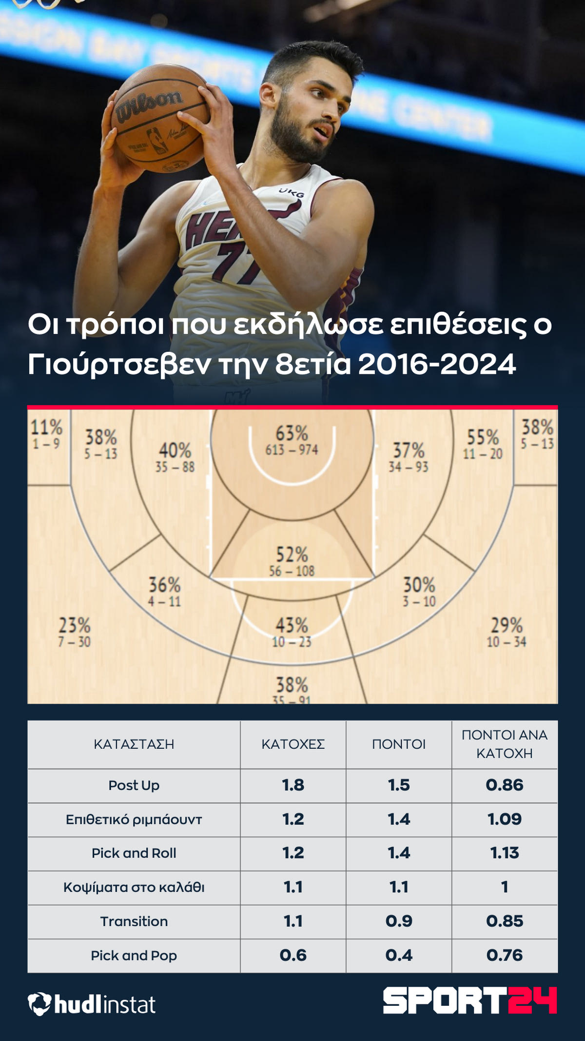 Λαμβάνοντας υπόψη τους αριθμούς και την εικόνα του Γιούρτσεβεν σε βάθος 8ετίας (2016-2024) σε όλες τις διοργανώσεις που συμμετείχε αυτό το διάστημα (238 αγώνες στο σύνολο), υπάρχουν συγκεκριμένα στοιχεία που χαρακτηρίζουν το παιχνίδι του, με βάση και αυτά που του ζητήθηκαν να κάνει στο παρκέ.