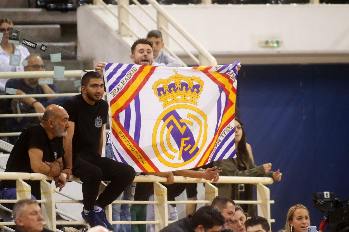 Με σημαία της Ρεάλ Μαδρίτης πήγε οπαδός του ΠΑΟΚ στο Παλατάκι το βράδυ της Πέμπτης (25/5), για το Game 2 της ημιτελικής σειράς της Basket League με τον Ολυμπιακό. Τη σήκωσε μάλιστα προς το μέρος των ερυθρόλευκων, που έπαιξαν με αποφασιστικότητα και πήραν μία άνετη νίκη τέσσερις μόλις ημέρες μετά από την ήττα-σοκ στον τελικό της EuroLeague από τους Μαδριλένους.