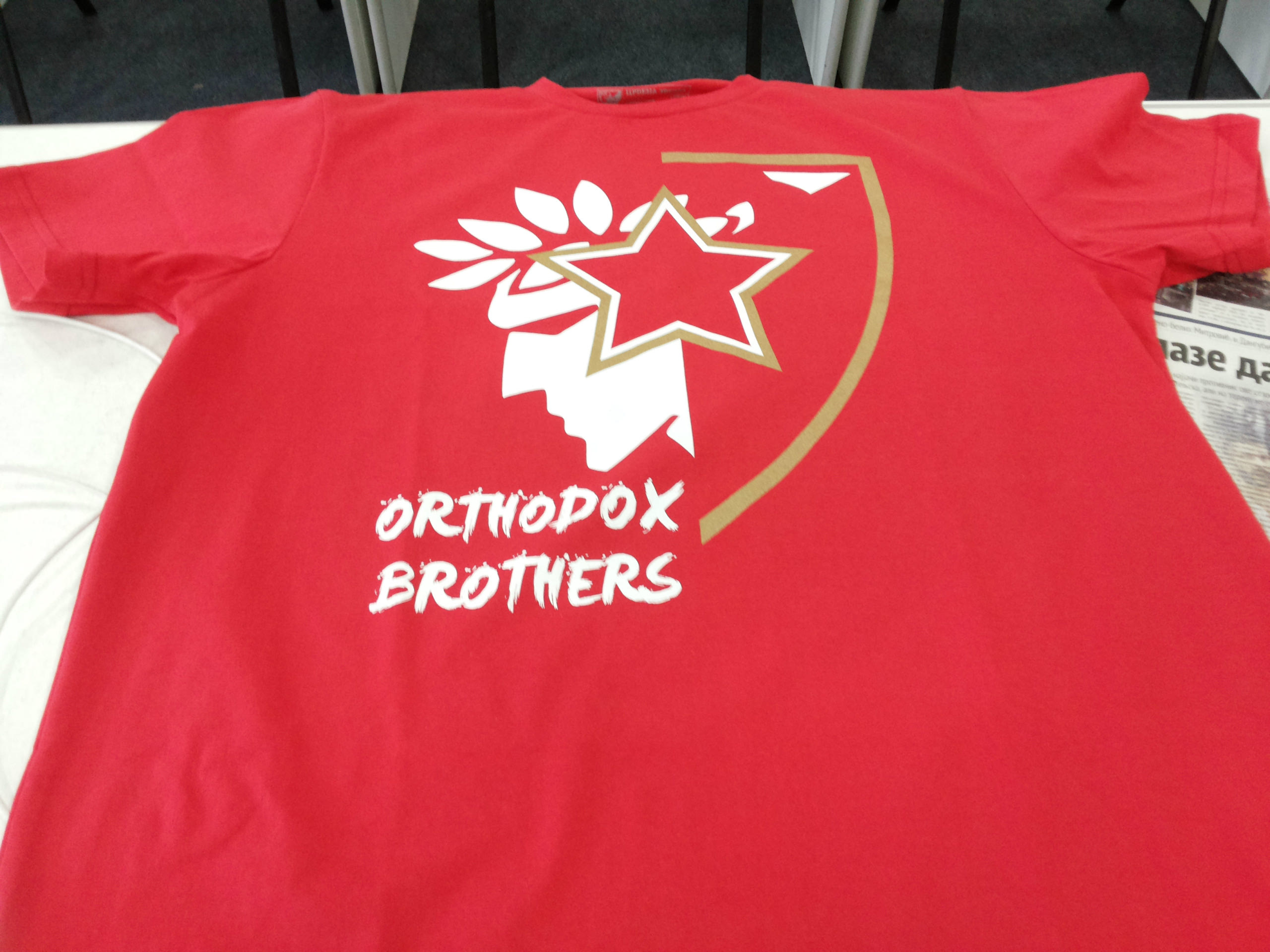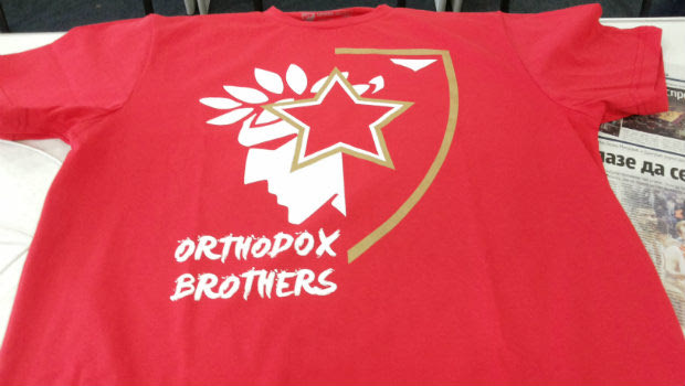 Τα εμβλήματα των δυο συλλόγων έγιναν… ένα, με την απαραίτητη αναφορά ”Orthodox Brothers”, πάντα σε κόκκινο φόντο! Αυτά ακριβώς τα t-shirts θα φορεθούν αύριο, ειδικά για την περίσταση, στο πάρτι που θα στήσουν οι 20.000 Delije και οι οπαδοί του Ολυμπιακού στη μεγάλη αρένα του Βελιγραδίου!