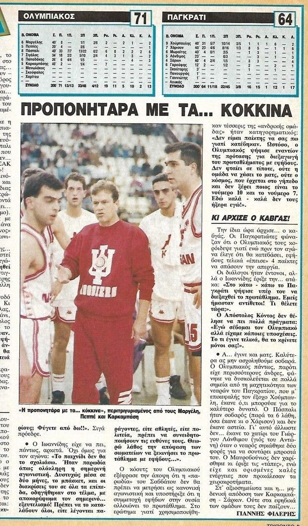 Ο αείμνηστος Γιάννης Ιωαννίδης, φορώντας μια φόρμα του πανεπιστημίου της Ιντιάνα, κατέβηκε από την εξέδρα για να … κοουτσάρει, αφού ο Ολυμπιακός είχε εν μέρει ανδρική ομάδα. Σκέτη παρωδία, όπως σημείωνε μετά το ματς ο Απόστολος Κόντος, προπονητής του Παγκρατίου. “Ναι, αλλά εμείς ψηφίσαμε να μη γίνει η αγωνιστική, το Παγκράτι όχι” υπενθύμιζε ο “ξανθός”.