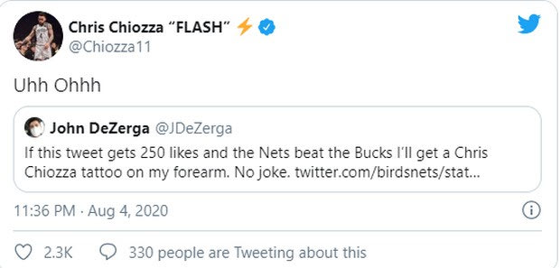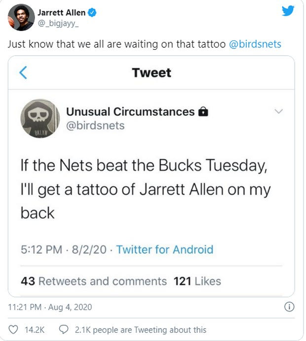 Συγκεκριμένα, ένας χρήστης του twitter είπε ότι σε περίπτωση που οι Νετς νικήσουν θα κάνει τατουάζ τον Τζάρετ Άλεν στην πλάτη, ενώ ένας άλλος είπε πως αν το tweet του έπιανε 250 like και οι Νετς νικούσαν θα έκανε τατουάζ τον Κρις Κιόζα στο χέρι του. Με το Μπρούκλιν λοιπόν να κάνει την έκπληξη και να επικρατεί με 119-116 των Μπακς, τόσο ο Άλεν όσο και ο Κιόζα πόσταραν τα συγκεκριμένα tweets στους δικούς τους λογαριασμούς, κάνοντας την σχετική πλάκα.