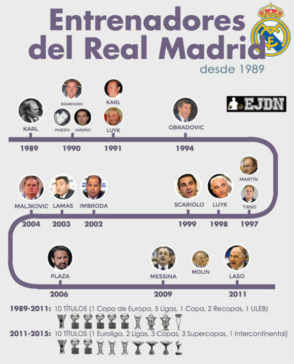 Οι συγκεκριμένοι αριθμοί αποκτούν μεγαλύτερη αξία αν αναλογιστεί κανείς ότι η Ρεάλ κατέκτησε 10 τίτλους την περίοδο 1989-2011, με 16 διαφορετικούς κόουτς που προηγήθηκαν του Λάσο! Μεταξύ αυτών, ο Ζέλικο Ομπράντοβιτς, ο Μπόζινταρ Μάλκοβιτς, ο Σέρτζιο Σκαριόλο, ο Τζοάν Πλάθα και ο Έτορε Μεσίνα. Δίχως αμφιβολία, η παρουσία του Λάσο στο Barclaycard Center έχει επαναφέρει τη σταθερότητα στη Μαδρίτη. Το Euroleague Greece κάνει rewind στους προπονητές που πέρασαν από τον πάγκο της “Βασίλισσας”, συγκρίνει πρόσωπα και καταστάσεις, παρουσιάζοντας τα πεπραγμένα σε μια από τις πιο δύσκολες δουλειές στο ευρωπαϊκό μπάσκετ. Αυτήν του κόουτς των “blancos”.