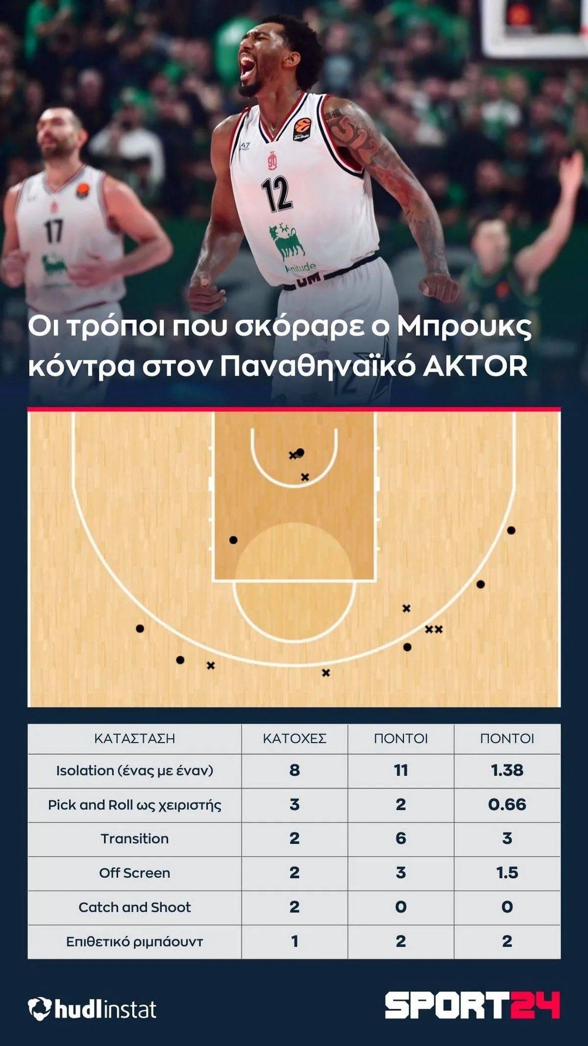 *Με κυκλάκι τα εύστοχα σουτ, με “x” τα άστοχαΣε αντίθεση με τον Μπράουν, ο Μπρουκς έκανε την ζημιά του με άλλο τρόπο. Με τον Παναθηναϊκό AKTOR να αμύνεται με αλλαγές πάνω του, ο Αμερικανός αποφάσισε να σημαδέψει τον Χουάντσο Ερνανγκόμεθ, σημειώνοντας πολλά δύσκολα καλάθια μπροστά στον Ισπανό, βρίσκοντας ρυθμό, πριν ολοκληρώσει την ζημιά που έκανε στο φινάλε.
