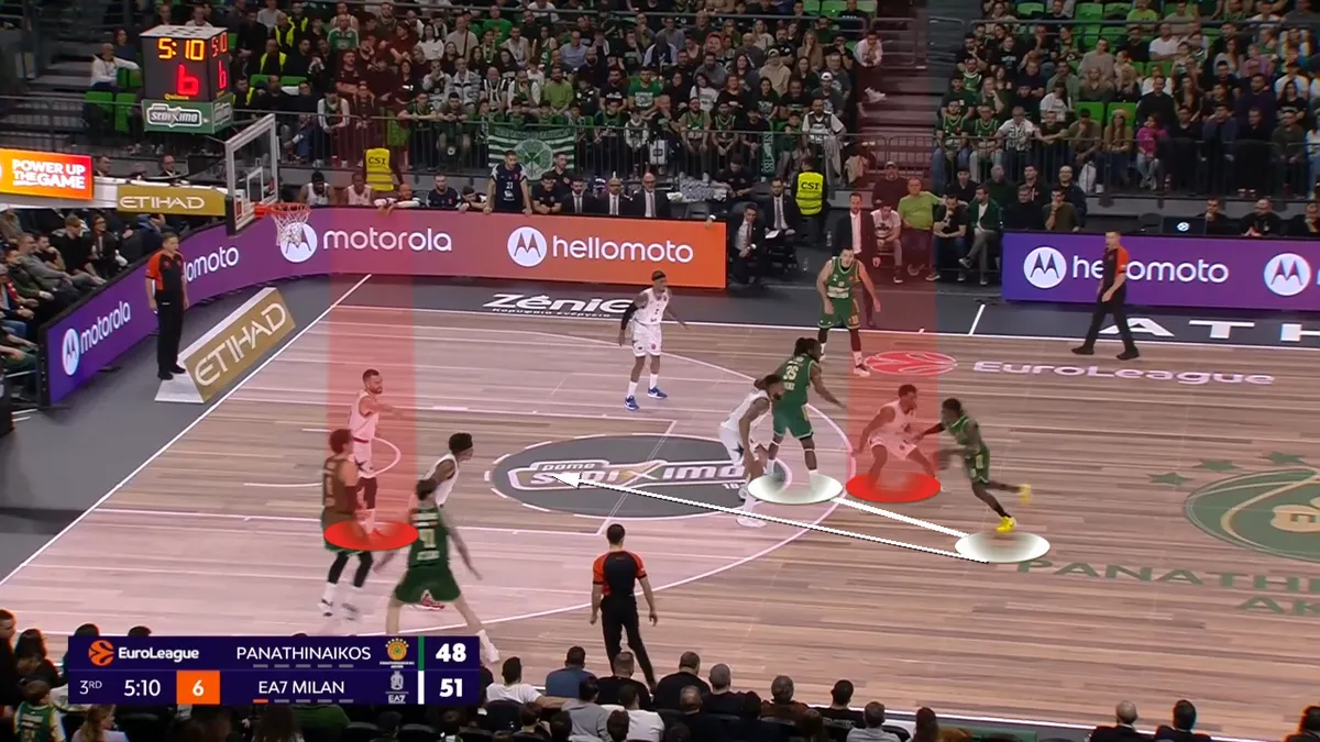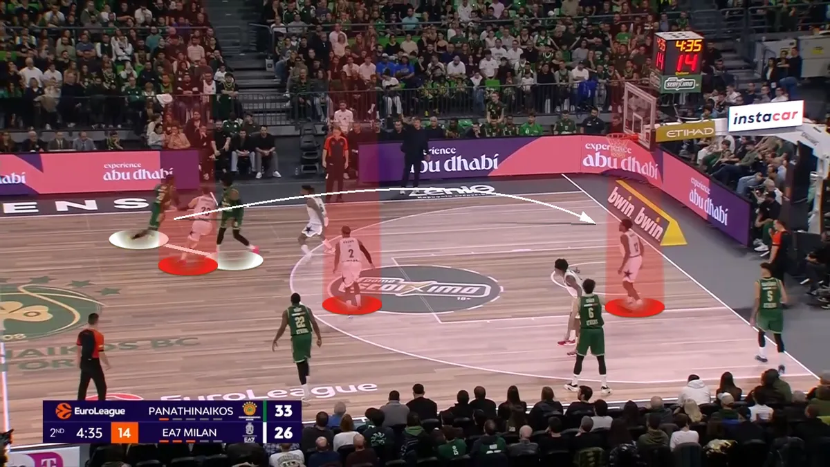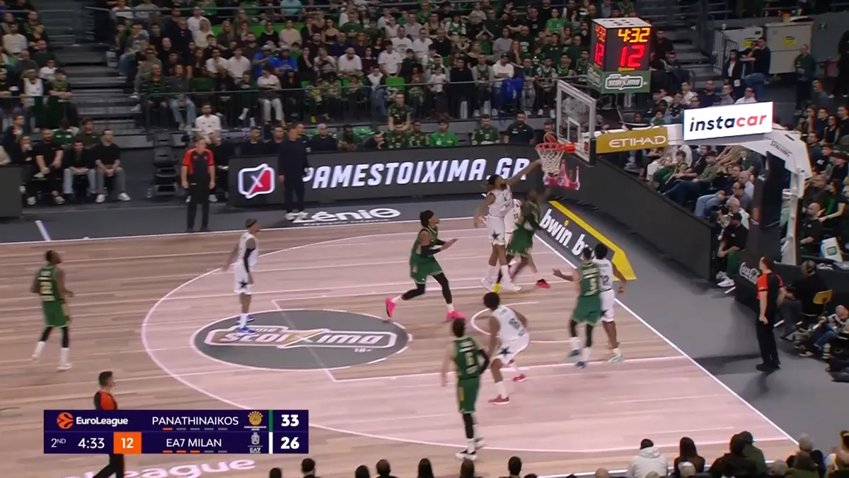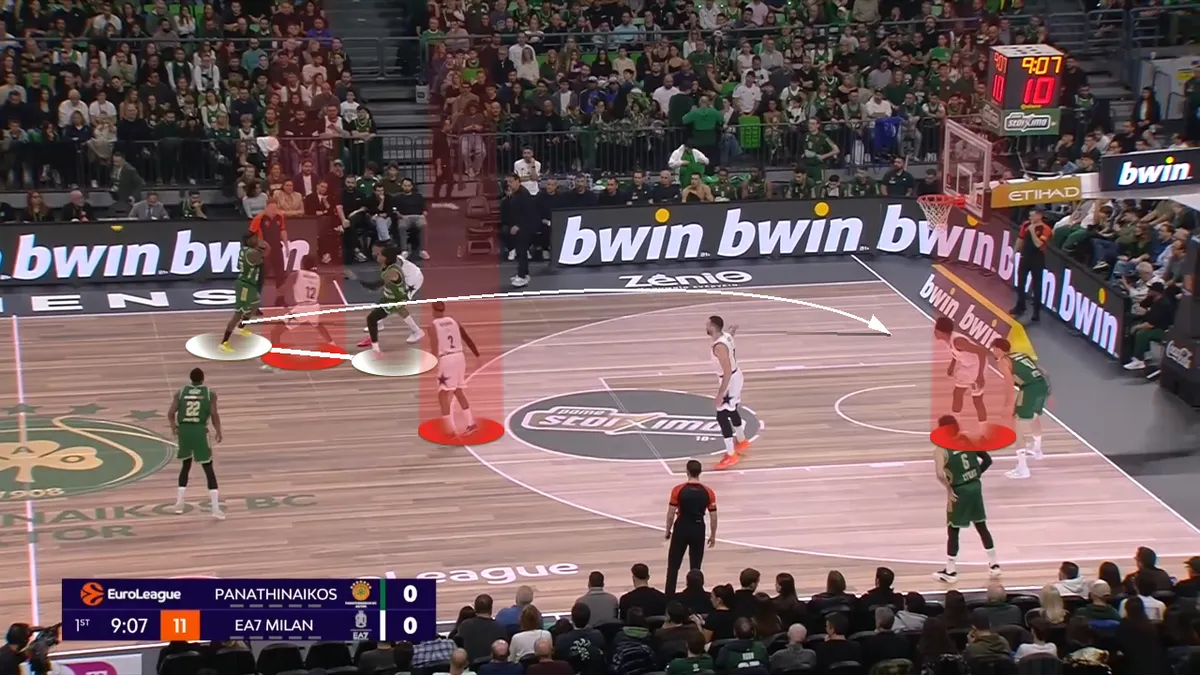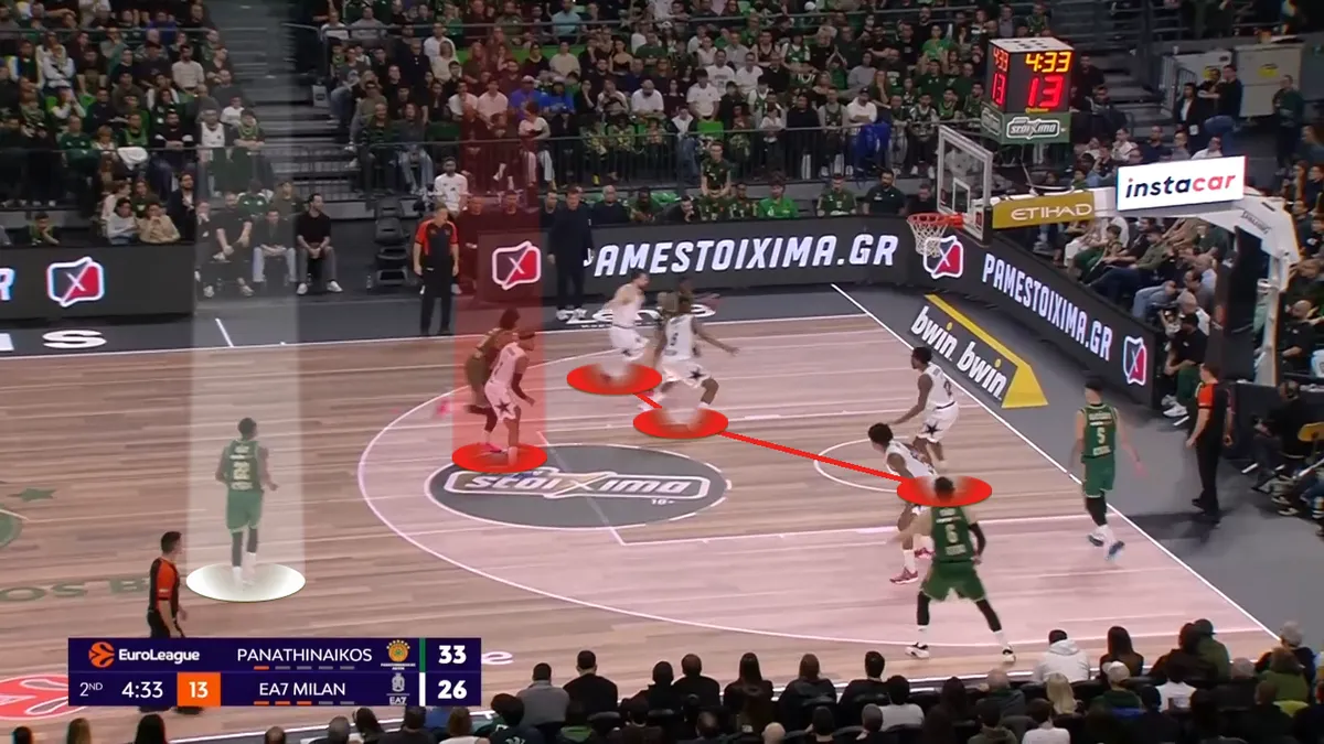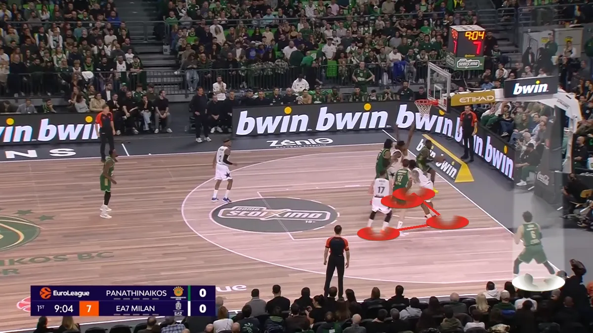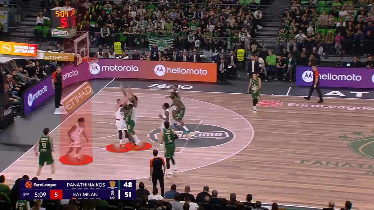 Ο Ναν πάει μέχρι μέσα με την άμυνα της Αρμάνι να κλείνει πάνω του, ενώ ο Μπράουν κλείνει την πάσα στον Χολμς και παράλληλα είναι σε θέση να αποτρέψει πάσα στον Γκραντ στο τρίποντο.
