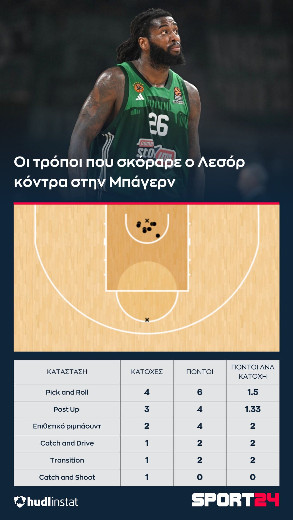Αυτό ωστόσο που φάνηκε για ακόμα μία φορά, είναι η χημεία των Ναν και Λεσόρ στο Pick and Roll. Με τον Εργκίν Αταμάν να είναι ξεκάθαρο ότι θέλει να προστατεύσει τον Σλούκα (αγωνίστηκε μόλις 13 λεπτά), ο Ναν είναι αυτός που στήνει τον κύριο όγκο των Pick and Roll του “τριφυλλιού” με τον Λεσόρ. Τα αποτελέσματα είναι ξεκάθαρα, με τον Παναθηναϊκό AKTOR να παίρνει συνολικά 17 πόντους από φάσεις όπου ο Λεσόρ έδωσε σκριν στον Ναν και εκδήλωσε επίθεση ένας από τους δύο. Για την ακρίβεια, ο Ναν σημείωσε τους 13 από τους 17 πόντους του έπειτα από σκριν που πήρε από τον Λεσόρ.