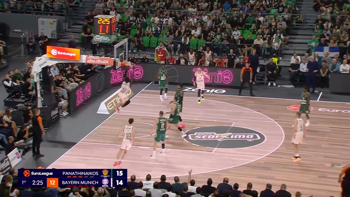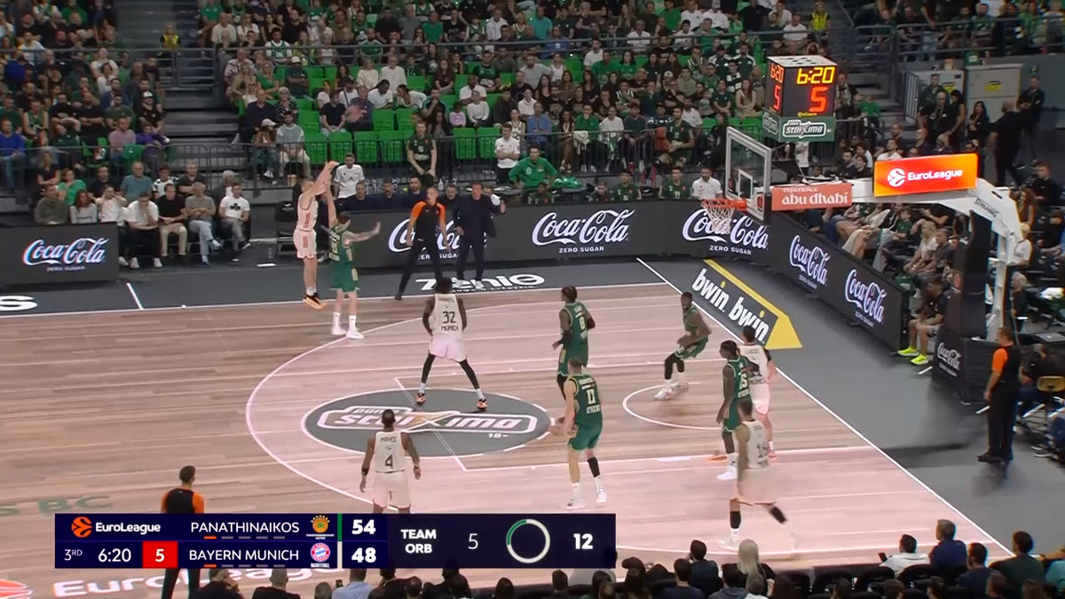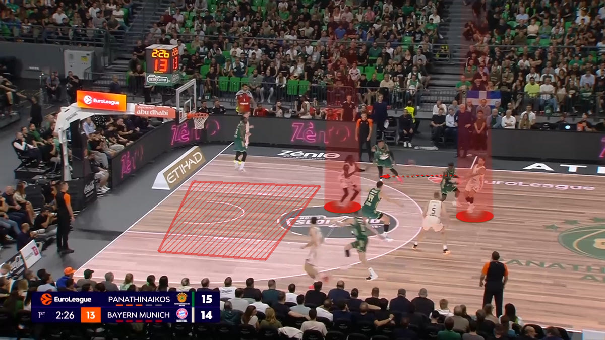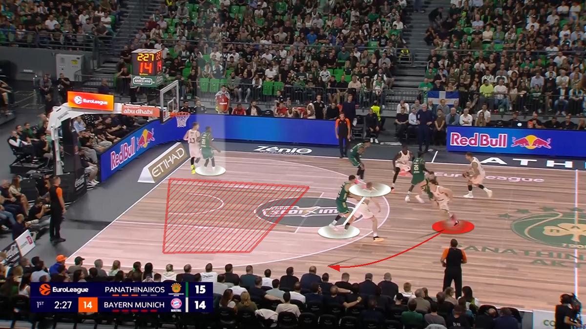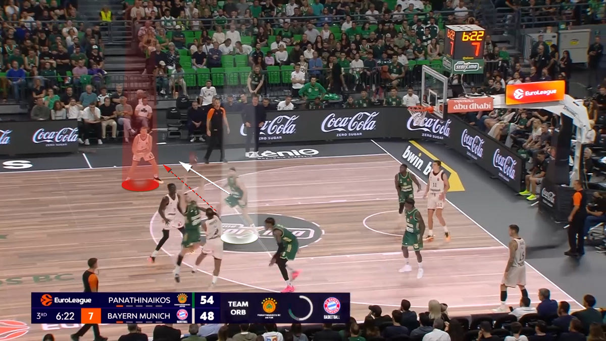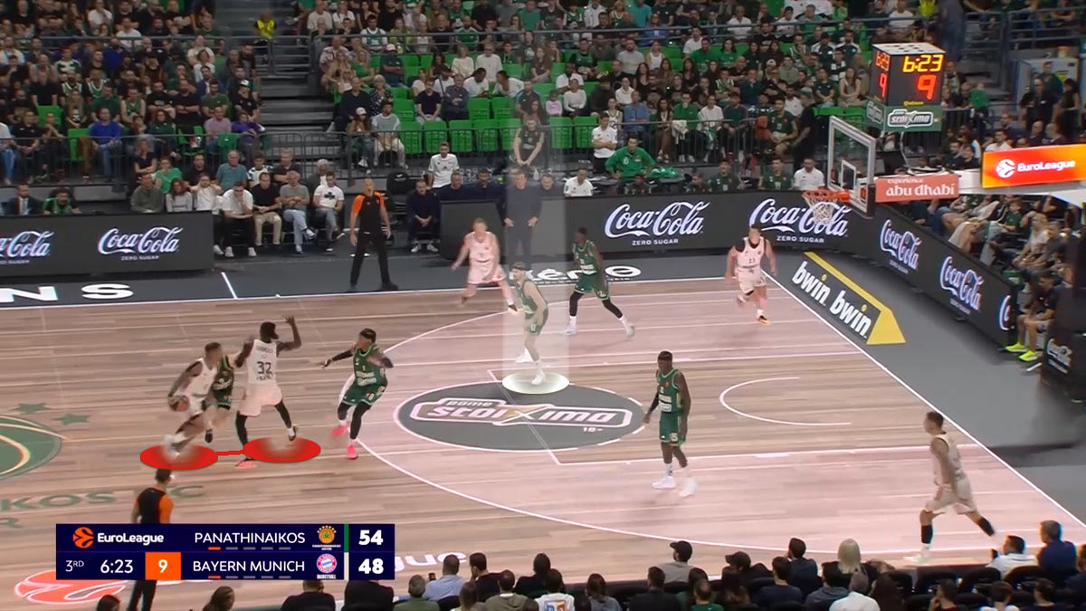 Ο Παναθηναϊκός AKTOR είδε την Μπάγερν να του δημιουργεί θέματα στην πίσω πλευρά του παρκέ Οι Βαυαροί παίζουν γρήγορα σε καταστάσεις μισού γηπέδου και αυτό δυσκολεύει τις ομάδες. Οι “πράσινοι” φάνηκαν να έχουν θέματα στο πρώτο μέρος, ειδικά σε κατάσταση Pick and Roll, όπου είτε δέχονταν άμεσα καλάθι από τον ψηλό που ρόλαρε μετά το σκριν, είτε έβλεπαν έναν παίκτη της Μπάγερν να βρίσκει σουτ. Ιδού ένα παράδειγμα: