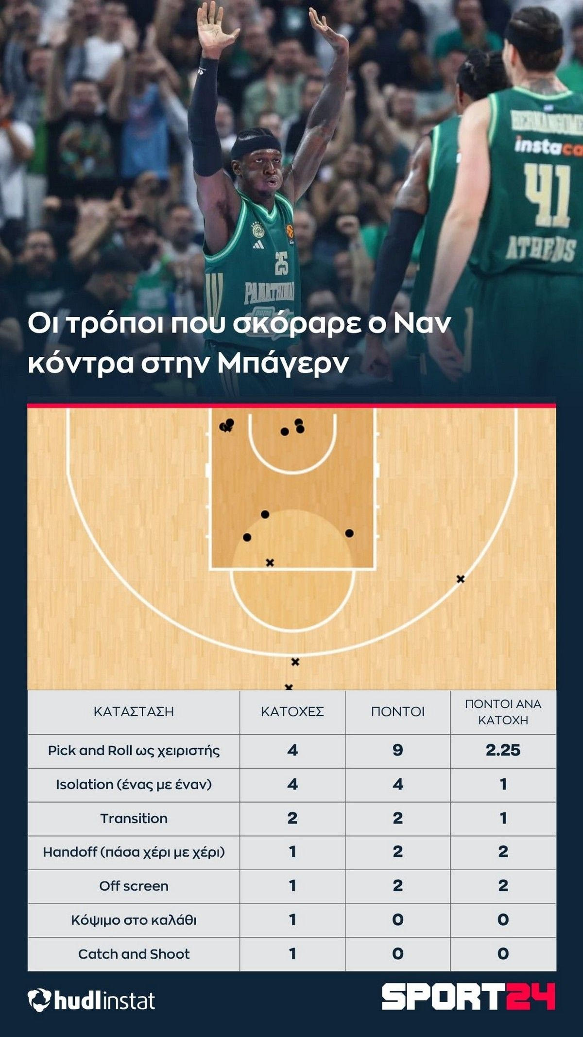 Ο Ναν έκανε αυτά που σε μεγάλο βαθμό κάνει σχεδόν πάντα: Κουβάλησε τον Παναθηναϊκό AKTOR τόσο εκτελεστικά, όσο και δημιουργικά, αφού – όπως σταδιακά ξεκίνησε πέρυσι – διάβασε σωστά το παιχνίδι και τελείωσε το ματς με 21 πόντους και 10 ασίστ (που έδωσαν άλλους 19 πόντους στους “πράσινους”, άρα ήταν υπεύθυνος για 40 από τους 87 πόντους της ομάδας του) σε 34 λεπτά συμμετοχής, ενώ είχε και ένα ξέσπασμα, που κλείδωσε τη νίκη.