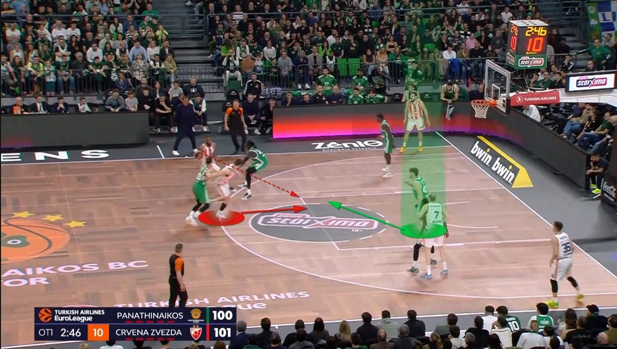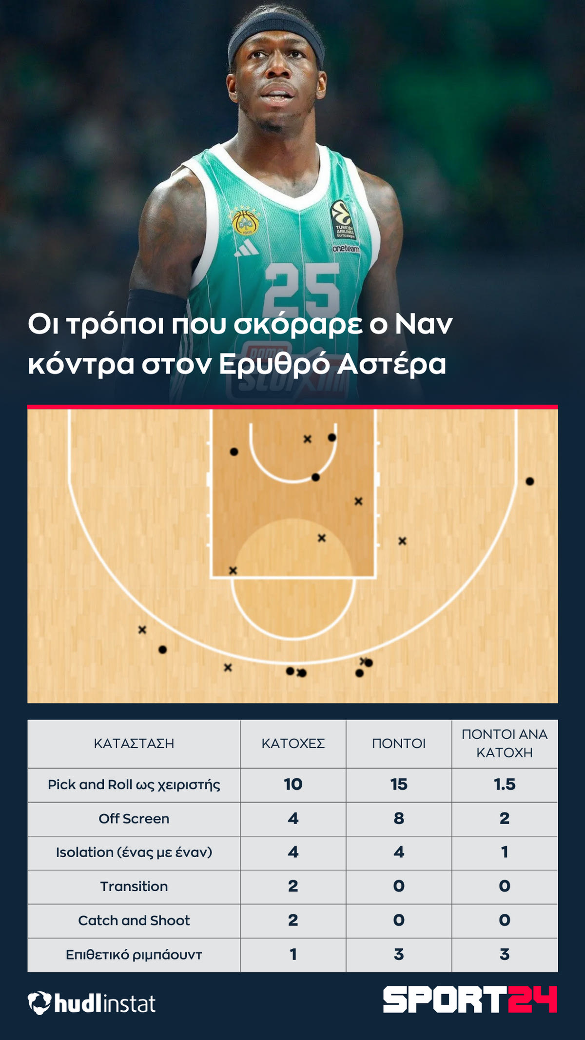 *Με κυκλάκι τα εύστοχα σουτ, με “x” τα άστοχαΟ Ναν διέλυσε την άμυνα του Ερυθρού Αστέρα σε κατάσταση Pick and Roll. Ο Αμερικανός είναι πιθανότατα ο κορυφαίος σουτέρ μετά από ντρίμπλα στην Ευρώπη, τιμωρώντας τους Σέρβους σε κάθε ευκαιρία. Αυτό όμως που τον κάνει να διαφέρει σε σχέση με πέρυσι, είναι πως πλέον είναι καλύτερος δημιουργός. Δεν ψάχνει αποκλειστικά το σουτ του, παρά βάζει στο παιχνίδι και τους συμπαίκτες του.