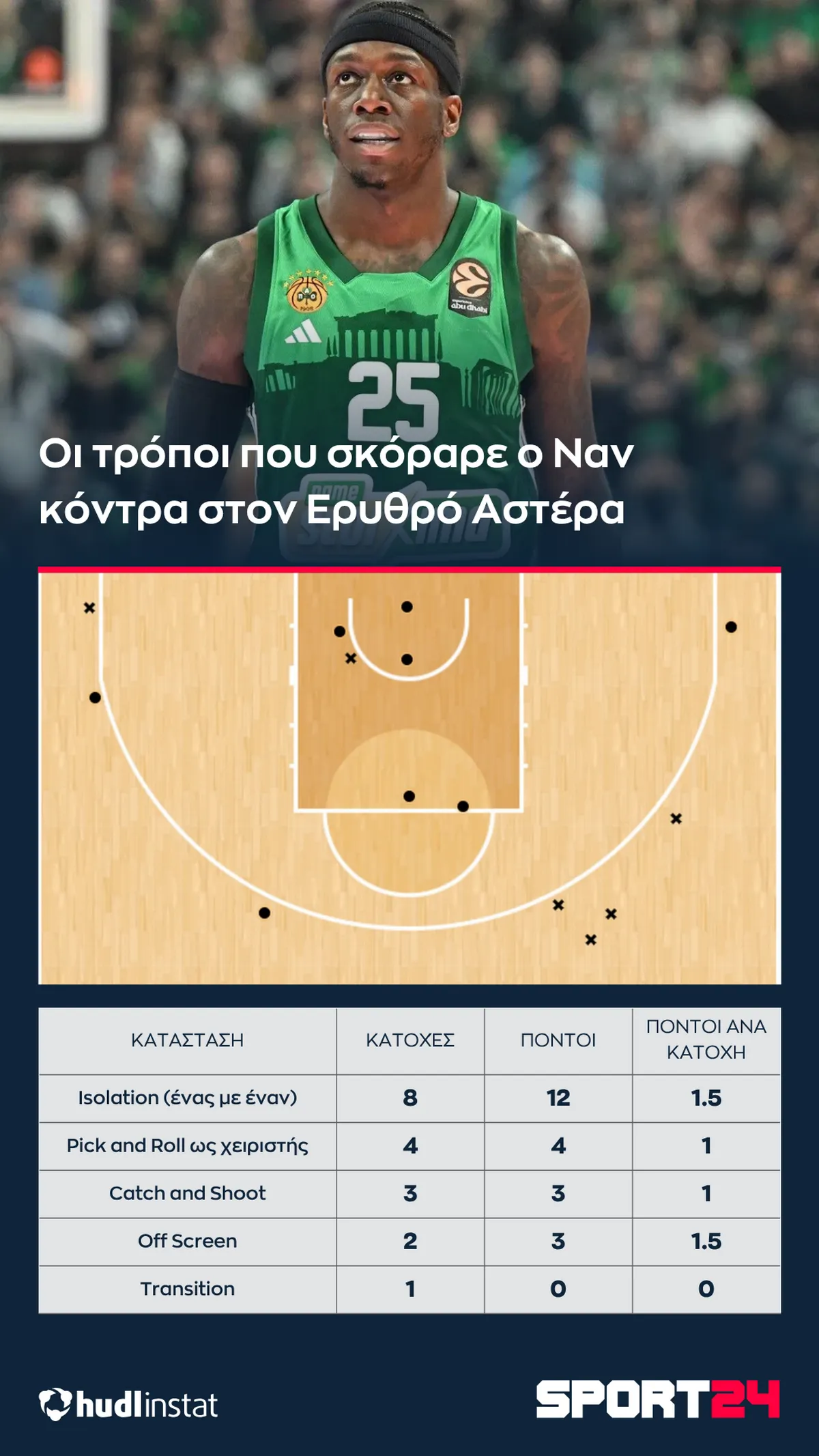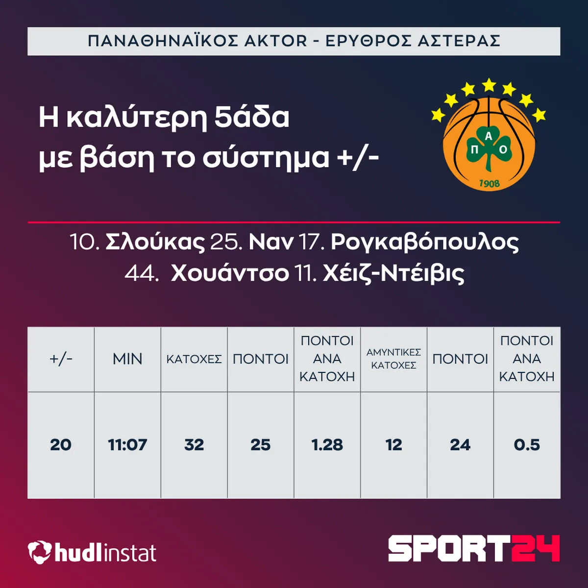 Ο Στέφανος Μακρής αναλύει με την βοήθεια του Hudl Instat την νίκη του Παναθηναϊκού AKTOR επί του Ερυθρού Αστέρα. Η πεντάδα-καμικάζι που έφερε τούμπα το ματς, το ξύπνημα του Ναν και ο Σλούκας που είχε μεν 0 πόντους, αλλά μοίρασε 19 με τις ασίστ του.