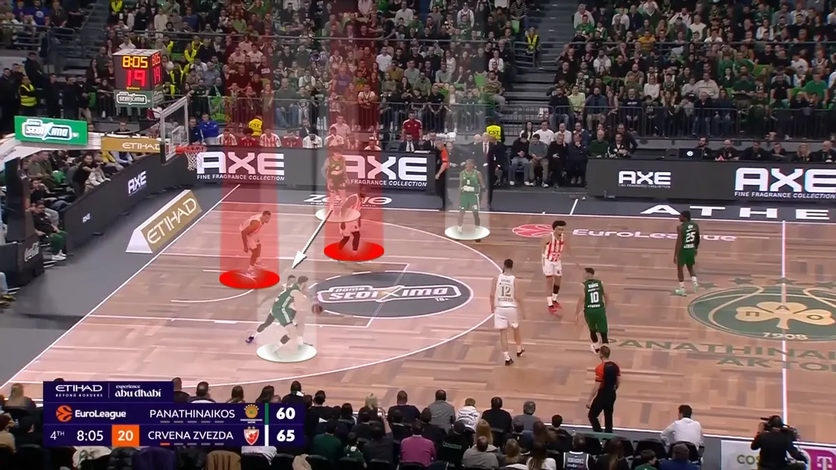 Ο Παναθηναϊκός AKTOR είχε πρόβλημα με την άμυνα με αλλαγές του Ερυθρού Αστέρα. Αυτή η πεντάδα ωστόσο τού έδωσε κάτι που είχε μεγάλη ανάγκη: Καλύτερες αποστάσεις, αφού είχε 5 παίκτες που μπορούσαν να σουτάρουν από την περιφέρεια. Κάπως έτσι, οι “πράσινοι” έπαιξαν πρακτικά πολλές φορές “5 out”. Είχαν δηλαδή πέντε παίκτες στην περιφέρεια. Αυτό άνοιξε τους χώρους για τον Κέντρικ Ναν (20 πόντοι με 8/14 σουτ σε 30 λεπτά συμμετοχής).