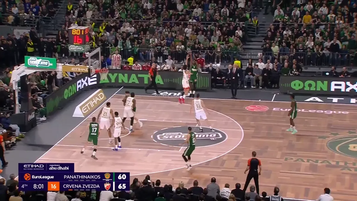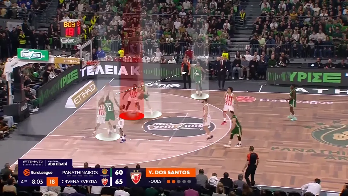 Ο Ρογκαβόπουλος ποστάρει τον Ντος Σάντος. Ο Χουάντσο είναι στην γωνία και ετοιμάζεται να κόψει στο καλάθι, ενώ ο Χέιζ-Ντέιβις είναι στις 45 μοίρες. Ο Ερυθρός Αστέρας ετοιμάζεται να δώσει βοήθεια.