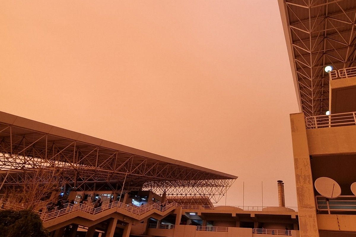 Η αφρικανική σκόνη σκέπασε λοιπόν το ΟΑΚΑ περίπου μιάμιση ώρα πριν από την έναρξη του αγώνα, κάνοντας τα πάντα… πορτοκαλί.