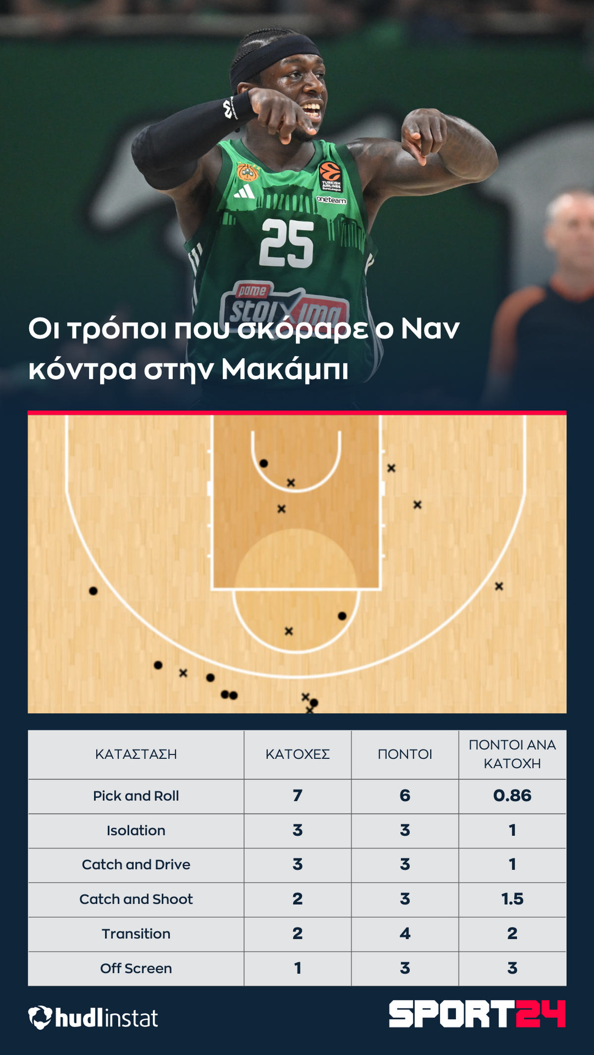 Είναι εύκολο – και απλό – να σταθεί κάποιος στην εκτελεστική δεινότητα του Αμερικανού, ο οποίος στην 4η περίοδο έδωσε ρεσιτάλ. Στην πραγματικότητα όμως ο Ναν έκανε την διαφορά λόγω του τρόπου που προσέγγισε το ματς στις τρεις πρώτες περιόδους, όταν διάβασε σωστά το παιχνίδι, βάζοντας σε αυτό και τους συμπαίκτες του. Σύμφωνα με το Hudl Instat, ο Ναν ήταν συνολικά υπεύθυνος για 44 πόντους των “πράσινων” στο παιχνίδι. Πέρα από τους 26 πόντους του, οι 5 ασίστ του έδωσαν άλλους 12 πόντους, ενώ έδωσε άλλες τρεις “secondary assist”, που πρόσφεραν άλλους 6 πόντους.