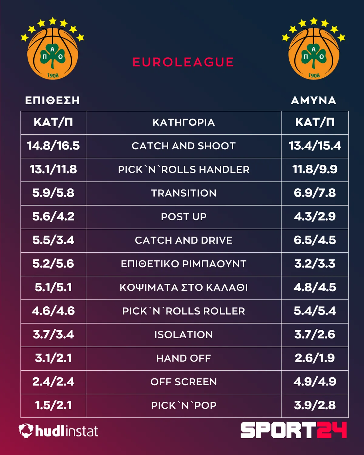 Τα προβλήματα στον Παναθηναϊκό AKTOR ξεκινούν από την άμυνά του στο Pick and Roll, οπου με 0.84 πόντους ανά κατοχή παθητικό έχει την 7η χειρότερη επίδοση. Το πρόβλημα ωστόσο συνεχίζεται από εκεί και πέρα, με τους “πράσινους” να είναι για ακόμα μία φορά μία από τις χειρότερες ομάδες στην άμυνα στο transition, αφού δέχονται 7.8 πόντους ανά αγώνα στο ανοιχτό γήπεδο (2η χειρότερη επίδοση). Παράλληλα, είναι η 2η χειρότερη ομάδα στον αριθμό των πόντων που δέχονται στο Pick and Roll από τον ψηλό (5.4 ανά αγώνα) και η 3η χειρότερη στους πόντους που δέχονται σε κατάσταση Catch and Shoot (15.4 ανά αγώνα) και η 2η χειρότερη σε καταστάσεις off screen (4.9 ανά αγώνα).