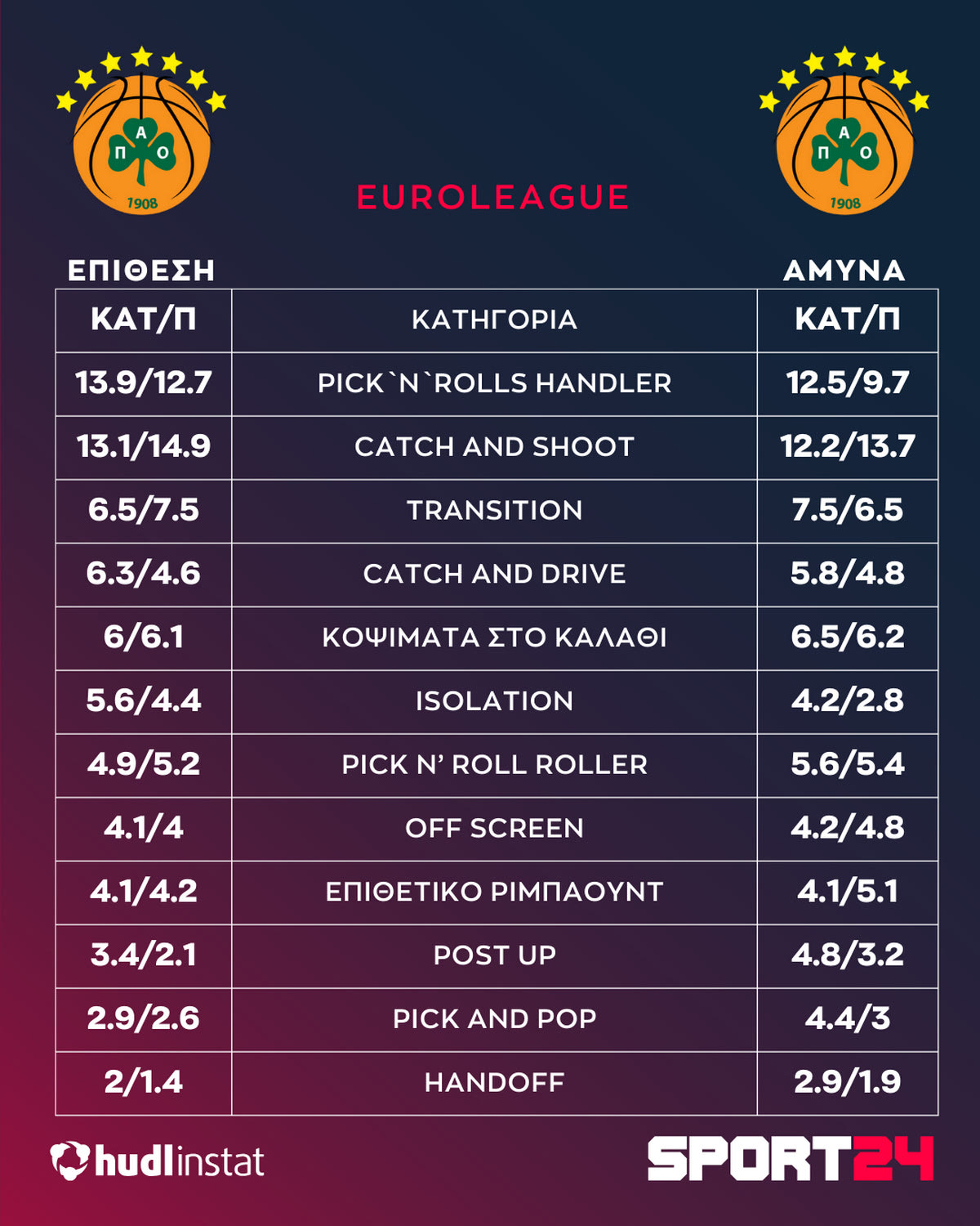 Από την στιγμή που τραυματίστηκε ο Γάλλος (αλλά και χάθηκε για σημαντικό διάστημα και ο Ομέρ Γιούρτσεβεν), ο Παναθηναϊκός AKTOR έριξε – απολύτως λογικά – το βάρος του ακόμα περισσότερο στην περιφέρεια. Οι “πράσινοι” στηρίχθηκαν ακόμα περισσότερο σε κατάσταση Pick and Roll όπου το σουτ πήρε ο χειριστής της μπάλας, έχοντας την 2η καλύτερη επίδοση σε τέτοια κατάσταση (0.91 ανά αγώνα), ενώ έβγαζαν κάτι παραπάνω από 13.1 σουτ ανά αγώνα σε κατάσταση Catch and Shoot (σουτ από στάση), ούσα η δεύτερη καλύτερη ομάδα σε αυτό.